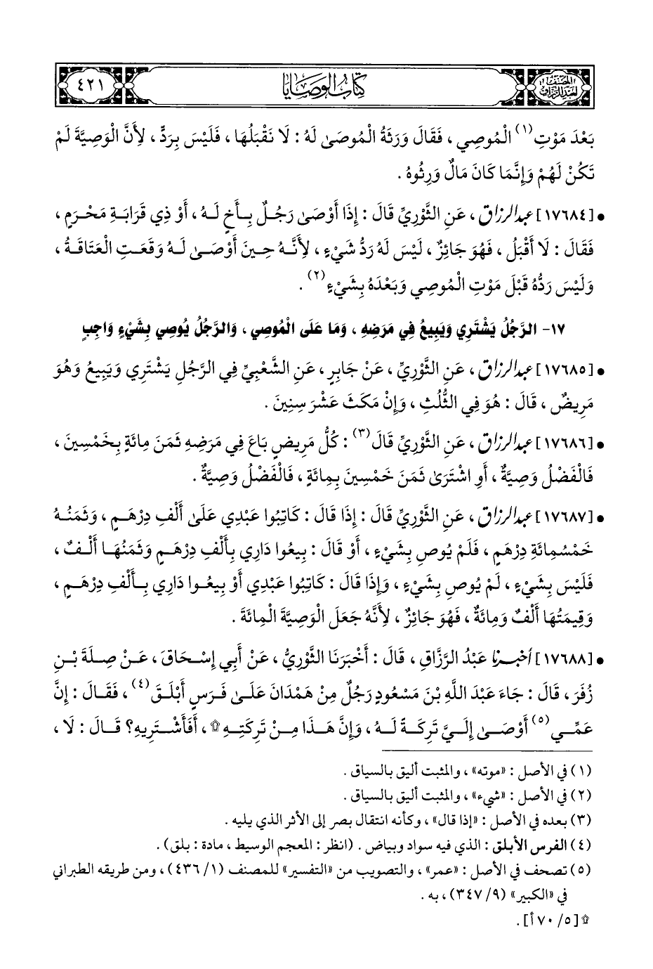 • [١٧٦٨٤] عبد الرزاق، عَنِ الثَّوْرِيِّ قَالَ: إِذَا أَوْصَى رَجُلٌ بِأَخٍ لَه، أَوْ ذِي قَرَابَةِ مَحْرَمٍ، فَقَالَ: لَا أَقْبَل، فَهُوَ جَائِزٌ، لَيْسَ لَهُ رَدُّ شَيْءٍ، لِأَنَّهُ حِينَ أَوْصَى لَهُ وَقَعَتِ الْعَتَاقَةُ، وَلَيْسَ رَدُّهُ قَبْلَ مَوْتِ الْمُوصِي وَبَعْدَهُ بِشَيْءٍ (¬٢).