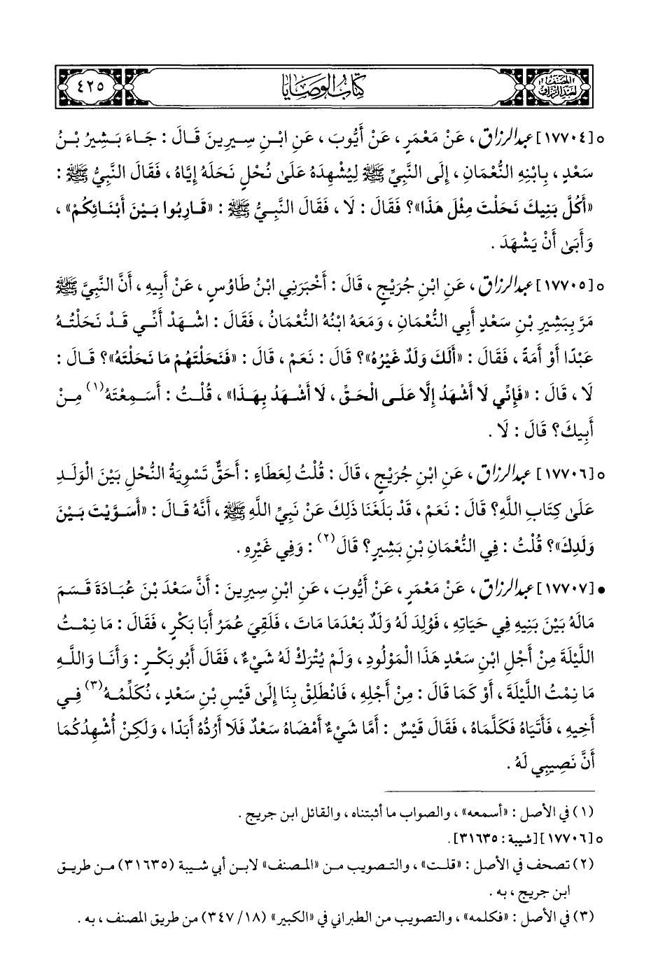 ° [١٧٧٠٦] عبد الرزاق، عَنِ ابْنِ جُرَيْجٍ، قَالَ: قُلْتُ لِعَطَاءٍ: أَحَقٌّ تَسْوِيَةُ النُّحْلِ بَيْنَ الْوَلَدِ عَلَى كِتَابِ اللهِ؟ قَالَ: نَعَمْ، قَدْ بَلَغَنَا ذَلِكَ عَنْ نَبِيِّ اللهِ - صلى الله عليه وسلم -، أَنَّهُ قَالَ: "أَسَوَّيْتَ بَيْنَ وَلَدِكَ"؟ قُلْتُ: فِي النُّعْمَانِ بْنِ بَشِيرٍ؟ قَالَ (¬٢): وَفِي غَيْرِهِ.