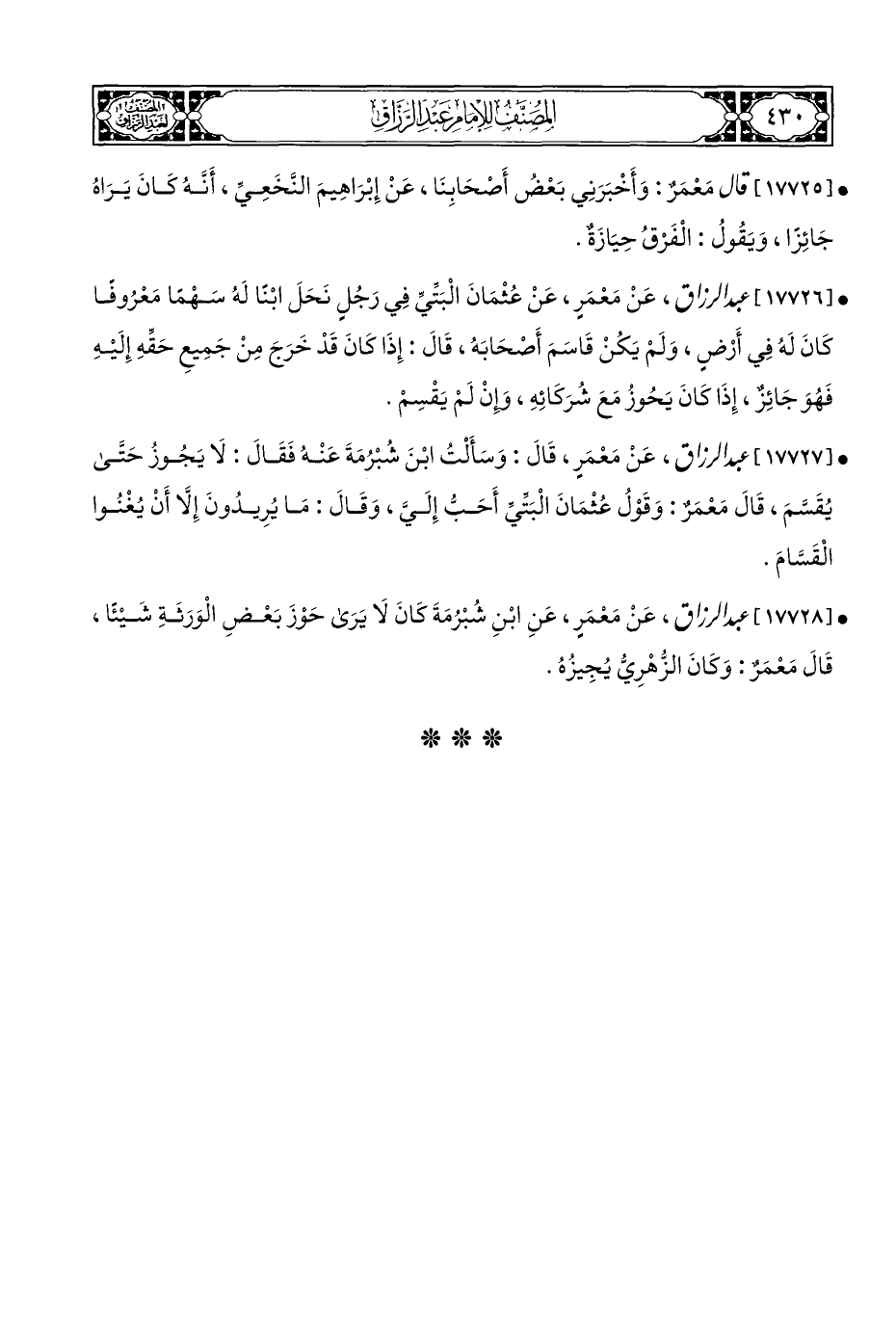 • [١٧٧٢٥] قال مَعْمَرٌ: وَأَخْبَرَنِي بَعْضُ أَصْحَابِنَا، عَنْ إِبْرَاهِيمَ النَّحَعِيِّ، أَنَّهُ كَانَ يَرَاهُ جَائِزًا، وَيَقُولُ: الْفَرْقُ حِيَازَةٌ.