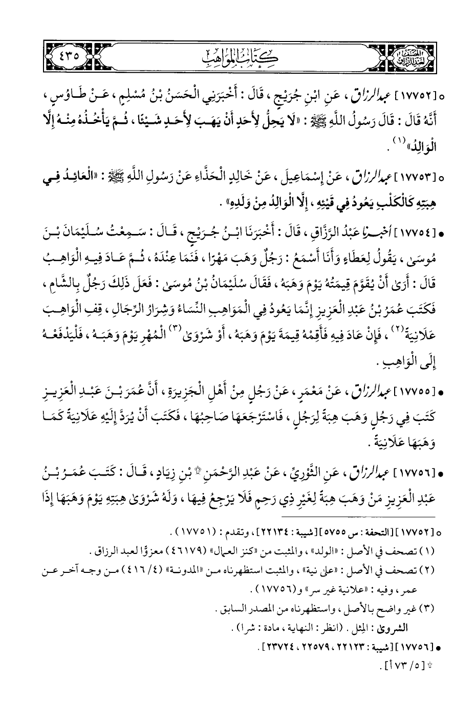 ° [١٧٧٥٢] عبد الرزاق، عَنِ ابْنِ جُرَيْجٍ، قَالَ: أَخْبَرَنِي الْحَسَنُ بْنُ مُسْلِمٍ، عَنْ طَاوُسٍ، أَنَّهُ قَالَ: قَالَ رَسُولُ اللهِ - صلى الله عليه وسلم -: "لَا يَحِلُّ لِأَحَدٍ أَنْ يَهَبَ لِأَحَدٍ شَيْئًا، ثُمَّ يَأْخُذُهُ مِنْهُ إِلَّا الْوَالِدُ" (¬١).