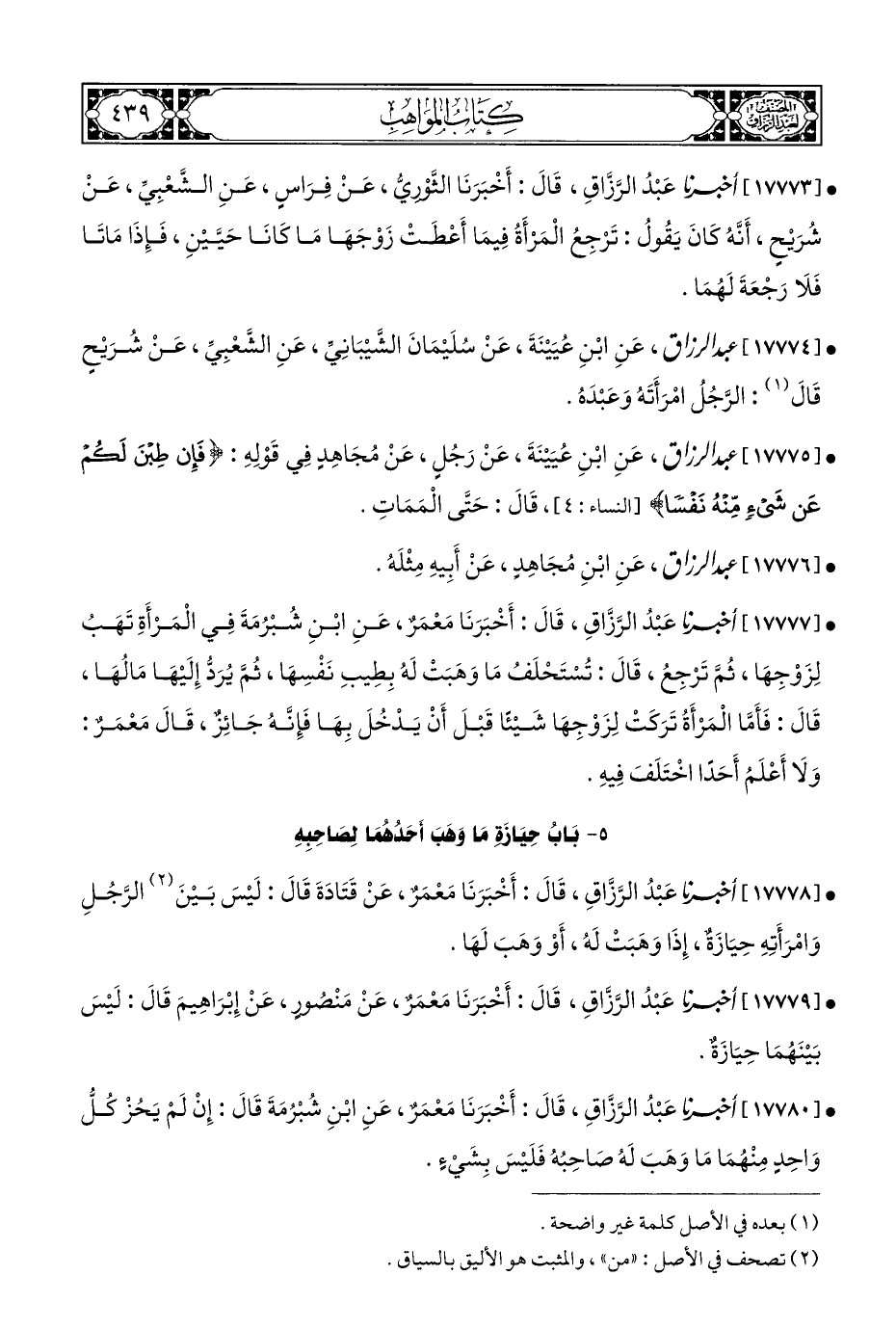 • [١٧٧٧٨] أخبرنا عَبْدُ الرَّزَّاقِ، قَالَ: أَخْبَرَنَا مَعْمَرٌ، عَنْ قَتَادَةَ قَالَ: لَيْسَ بَيْنَ (¬٢) الرَّجُلِ وَامْرَأَتِهِ حِيَازَةٌ، إِذَا وَهَبَتْ لَه، أَوْ وَهَبَ لَهَا.