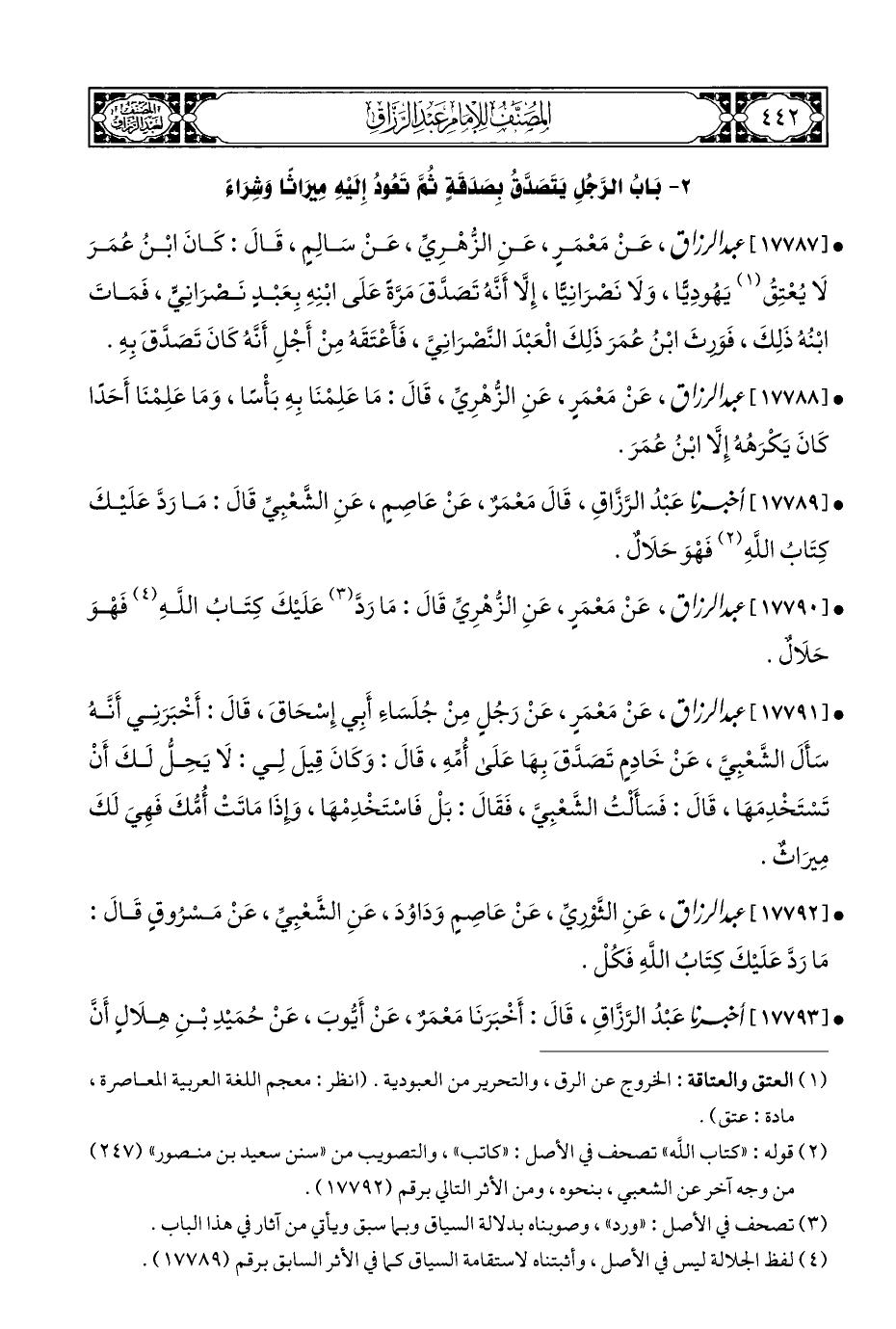 • [١٧٧٨٧] عبد الرزاق، عَنْ مَعْمَرٍ، عَنِ الزُّهْرِيِّ، عَنْ سَالِمٍ، قَالَ: كَانَ ابْنُ عُمَرَ لَا يُعْتِقُ (¬١) يَهُودِيًّا، وَلَا نَصْرَانِيًّا، إِلَّا أَنَّهُ تَصَدَّقَ مَرَّةً عَلَى ابْنِهِ بِعَبْدٍ نَصْرَانِيٍّ، فَمَاتَ ابْنُهُ ذَلِكَ، فَوَرِثَ ابْنُ عُمَرَ ذَلِكَ الْعَبْدَ النَّصْرَانِيَّ، فَأَعْتَقَهُ مِنْ أَجْلِ أَنَّهُ كَانَ تَصَدَّقَ بِهِ.