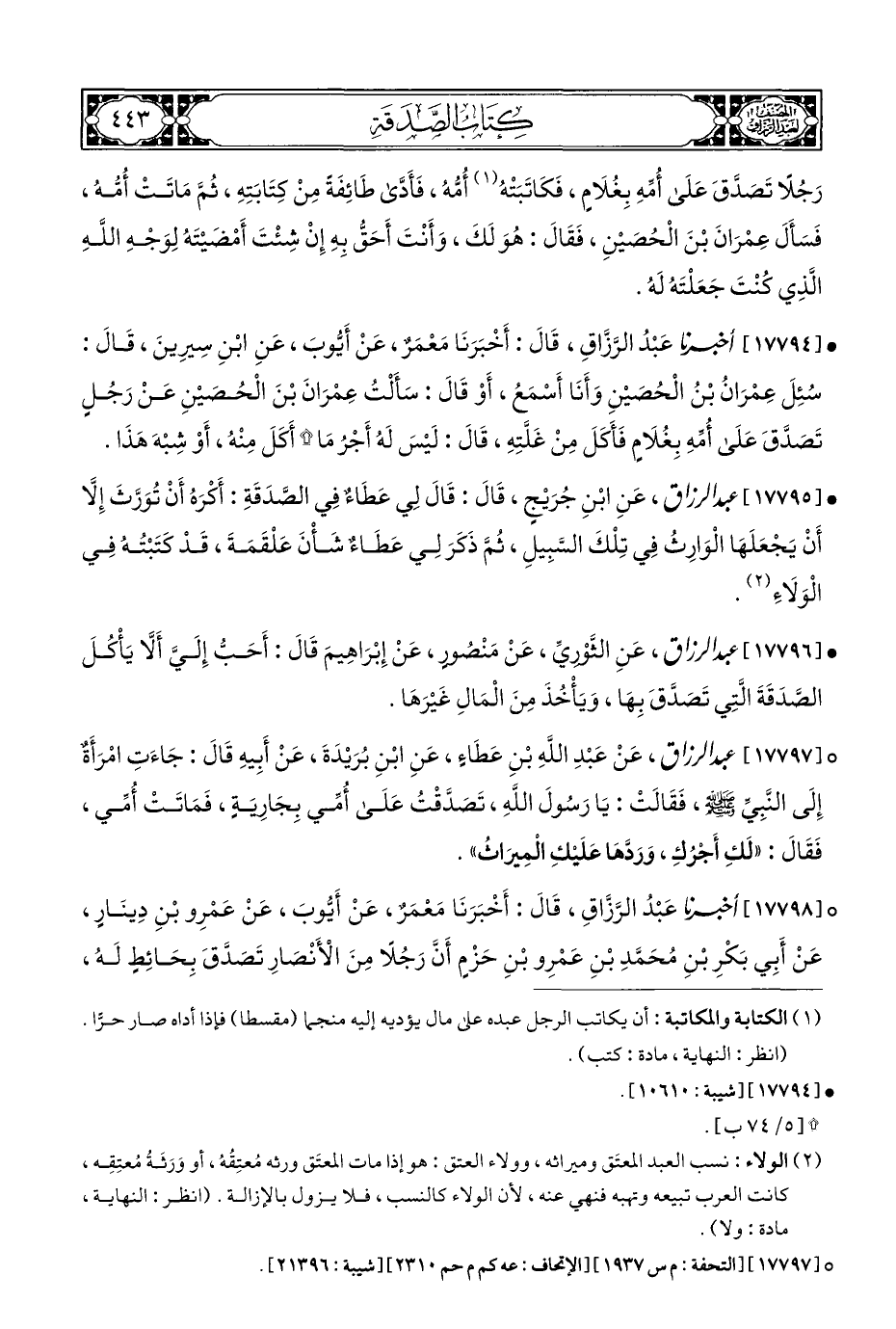° [١٧٧٩٨] أخبرنا عَبْدُ الرَّزَّاقِ، قَالَ: أَخْبَرَنَا مَعْمَرٌ، عَنْ أَيُّوبَ، عَنْ عَمْرِو بْنِ دِينَارٍ، عَنْ أَبِي بَكْرِ بْنِ محَمَّدِ بْنِ عَمْرِو بْنِ حَزْمٍ أَنَّ رَجُلًا مِنَ الْأَنْصَارِ تَصَدَّقَ بِحَائِطٍ لَه،