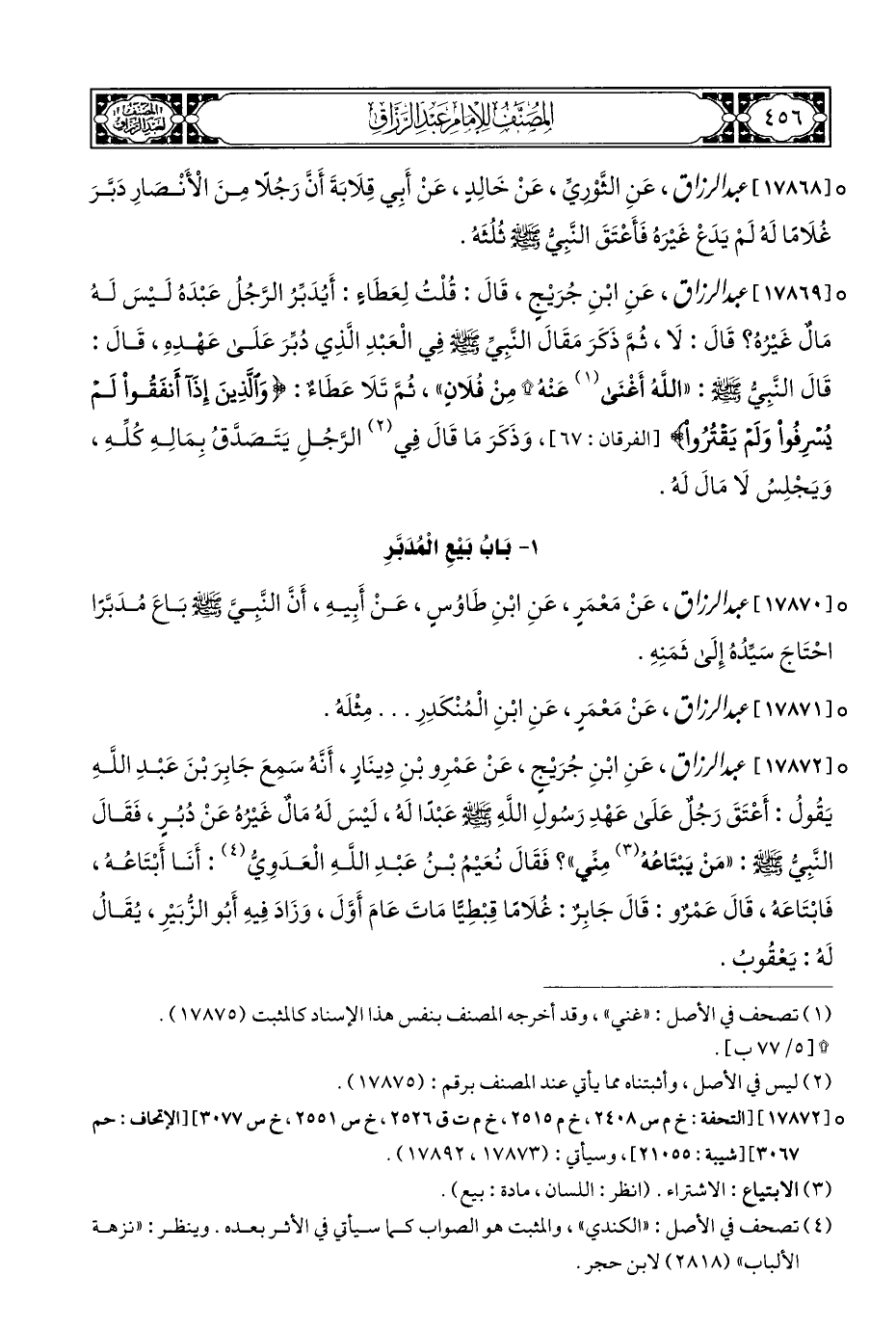 ° [١٧٨٦٩] عبد الرزاق، عَنِ ابْنِ جُرَيْجٍ، قَالَ: قُلْتُ لِعَطَاءٍ: أَيُدَبِّرُ الرَّجُلُ عَبْدَهُ لَيْسَ لَهُ مَالٌ غَيْرُهُ؟ قَالَ: لَا، ثُمَّ ذَكَرَ مَقَالَ النَّبِيِّ - صلى الله عليه وسلم - فِي الْعَبْدِ الَّذِي دُبِّرَ عَلَى عَهْدِهِ، قَالَ: قَالَ النَّبِيُّ - صلى الله عليه وسلم -: "اللهُ أَغْنَى (¬١) عَنْهُ * مِنْ فُلَانٍ"، ثُمَّ تَلَا عَطَاءٌ: {وَالَّذِينَ إِذَا أَنفَقُوا لَمْ يُسْرِفُوا وَلَمْ يَقتُرُوا} [الفرقان: ٦٧]، وَذَكَرَ مَا قَالَ فِي (¬٢) الرَّجُلِ يَتَصَدَّقُ بِمَالِهِ كُلِّهِ، وَيَجْلِسُ لَا مَالَ لَهُ.