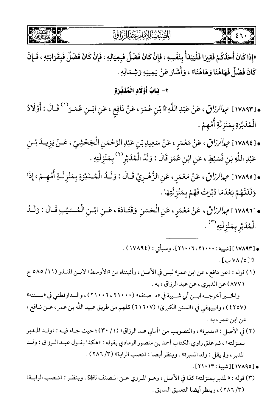 (¬٢) في الأصل: "المدبرة"، والتصويب من "أمالي عبد الرزاق" (١/ ٣٠)؛ حيث جاء فيه: "ولد المدبر بمنزلته"، ثم علق راوي الكتاب أحمد بن منصور الرمادي بقوله: "هكذا يقول عبد الرزاق: ولد المدبر، ولم يقل: ولد المدبرة". وينظر أيضا: "نصب الراية" (٣/ ٢٨٦).