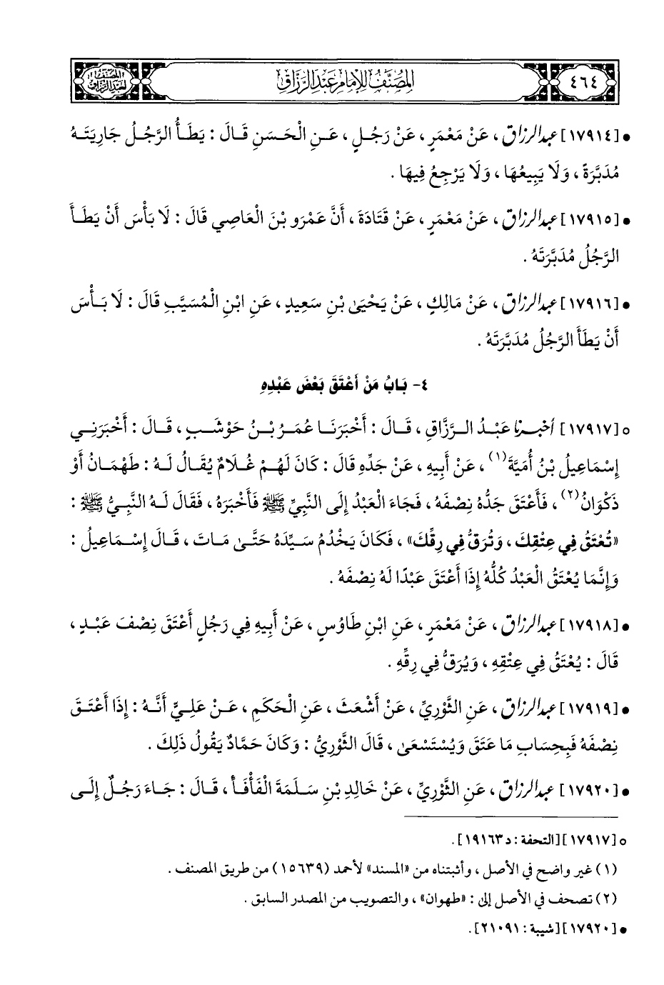 ° [١٧٩١٧] أخبرنا عَبْدُ الرَّزَّاقِ، قَالَ: أَخْبَرَنَا عُمَرُ بْنُ حَوْشَبٍ، قَالَ: أَخْبَرَنِي إِسْمَاعِيلُ بْنُ أُمَيَّةَ (¬١)، عَنْ أَبِيهِ، عَنْ جَدِّهِ قَالَ: كَانَ لَهُمْ غُلَامٌ يُقَالُ لَهُ: طَهْمَانُ أَوْ ذَكْوَانُ (¬٢)، فَأَعْتَقَ جَدُّهُ نِصْفَه، فَجَاءَ الْعَبْدُ إِلَى النَّبِيِّ - صلى الله عليه وسلم - فأَخْبَرَه، فَقَالَ لَهُ النَّبِيُّ - صلى الله عليه وسلم -: "تُعْتَقُ فِي عِتْقِكَ، وَتُرَقُّ فِي رِقَكَ"، فَكَانَ يَخْدُمُ سَيِّدَهُ حَتَّى مَاتَ، قَالَ إِسمَاعَيلُ: وإِنَّمَا يُعْتَقُ الْعَبْدُ كُلُّهُ إِذَا أَعْتَقَ عَبْدًا لَهُ نِصْفَهُ.