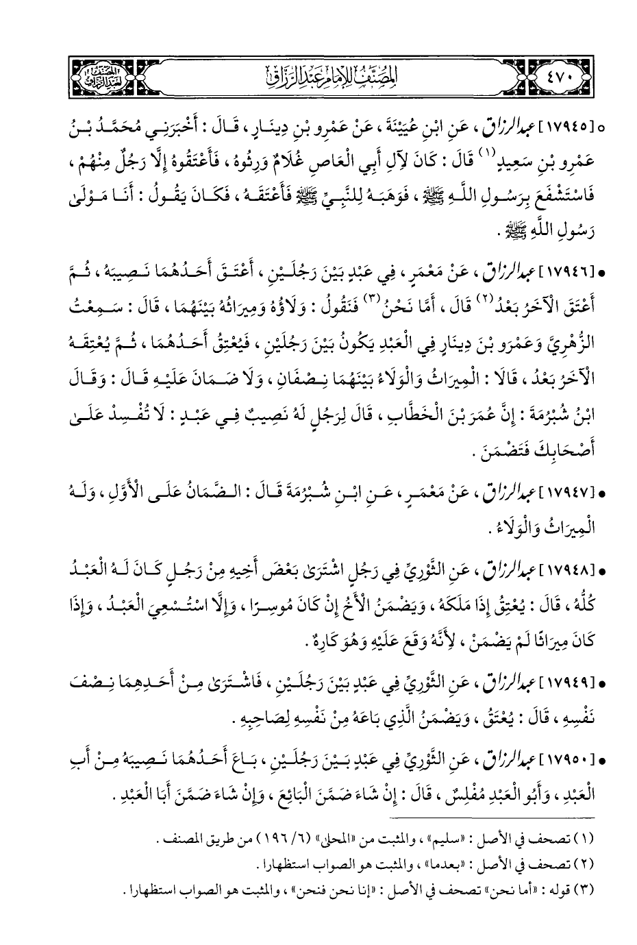 • [١٧٩٤٦] عبد الرزاق، عَنْ مَعْمَرٍ، فِي عَبْدٍ بَيْنَ رَجُلَيْنِ، أَعْتَقَ أَحَدُهُمَا نَصِيبَه، ثُمَّ أَعْتَقَ الْآخَرُ بَعْدُ (¬٢) قَالَ، أَمَّا نَحْنُ (¬٣) فَنَقُولُ: وَلَاؤُهُ وَمِيرَاثُهُ بَيْنَهُمَا، قَالَ: سَمِعْتُ الزُّهْرِيَّ وَعَمْرَو بْنَ دِينَارٍ فِي الْعَبْدِ يَكُونُ بَيْنَ رَجُلَيْنِ، فَيُعْتِقُ أَحَدُهُمَا، ثُمَّ يُعْتِقَهُ الْآخَرُ بَعْد، قَالَا: الْمِيرَاثُ وَالْوَلَاءُ بَيْنَهُمَا نِصْفَانِ، وَلَا ضَمَانَ عَلَيْهِ قَالَ: وَقَالَ ابْنُ شُبْرُمَةَ: إِنَّ عُمَرَ بْنَ الْخَطَّابِ، قَالَ لِرَجُلٍ لَهُ نَصِيبٌ فِي عَبْدٍ: لَا تُفْسِدْ عَلَى أَصْحَابِكَ فَتَضْمَنَ.