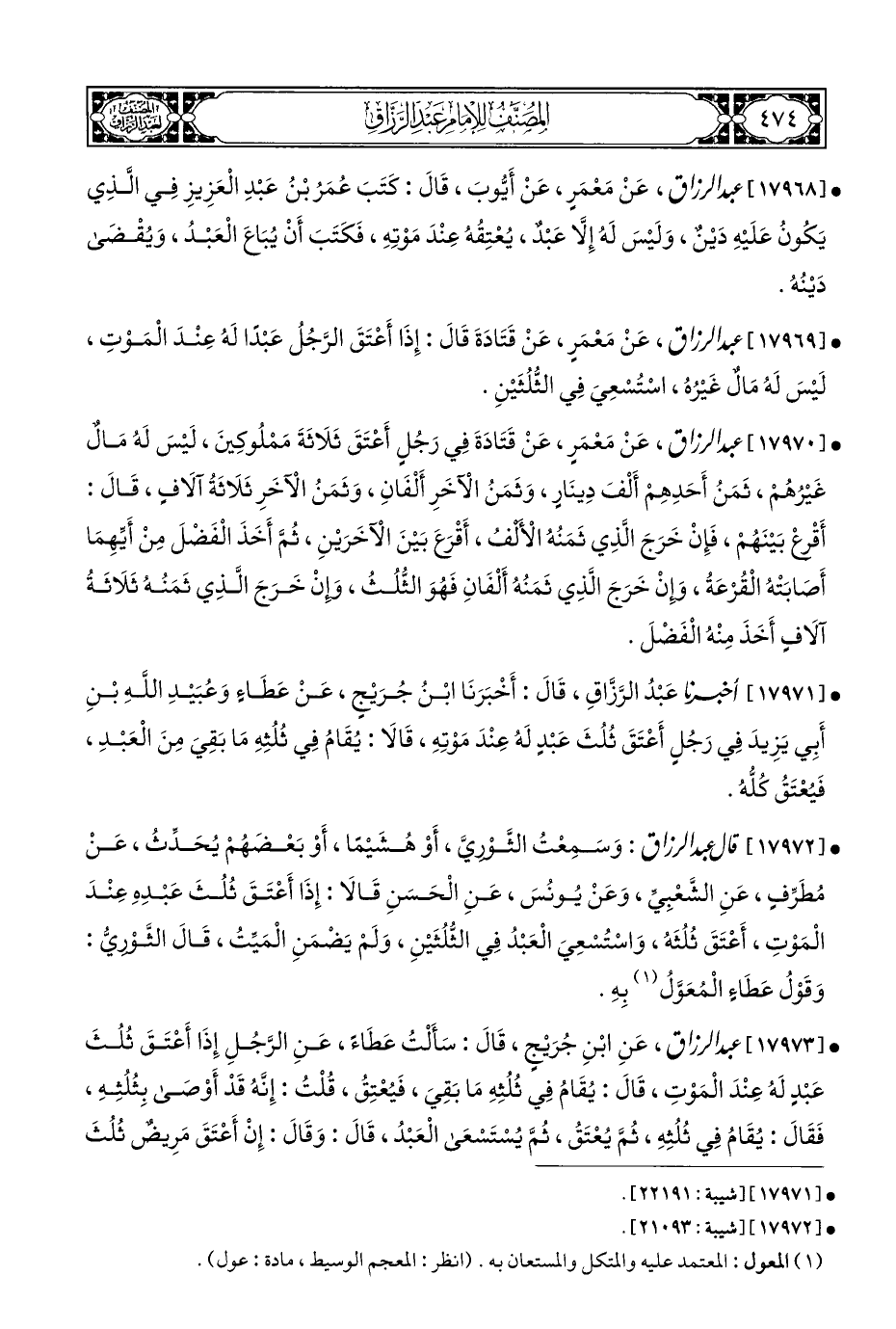• [١٧٩٧٢] قال عبد الرزاق: وَسَمِعْتُ الثَّوْرِيَّ، أَوْ هُشَيْمًا، أَوْ بَعْضَهُمْ يُحَدِّث، عَنْ مُطَرِّفٍ، عَنِ الشَّعْبِيِّ، وَعَنْ يُونُسَ، عَنِ الْحَسَنِ قَالَا: إِذَا أَعْتَقَ ثُلُثَ عَبْدِهِ عِنْدَ الْمَوْتِ، أَعْتَقَ ثُلُثَه، وَاسْتُسْعِيَ الْعَبْدُ فِي الثُّلُثَيْنِ، وَلَمْ يَضْمَنِ الْمَيِّت، قَالَ الثَّوْرِيُّ: وَقَوْلُ عَطَاءٍ الْمُعَوَّل (¬١) بِهِ.
