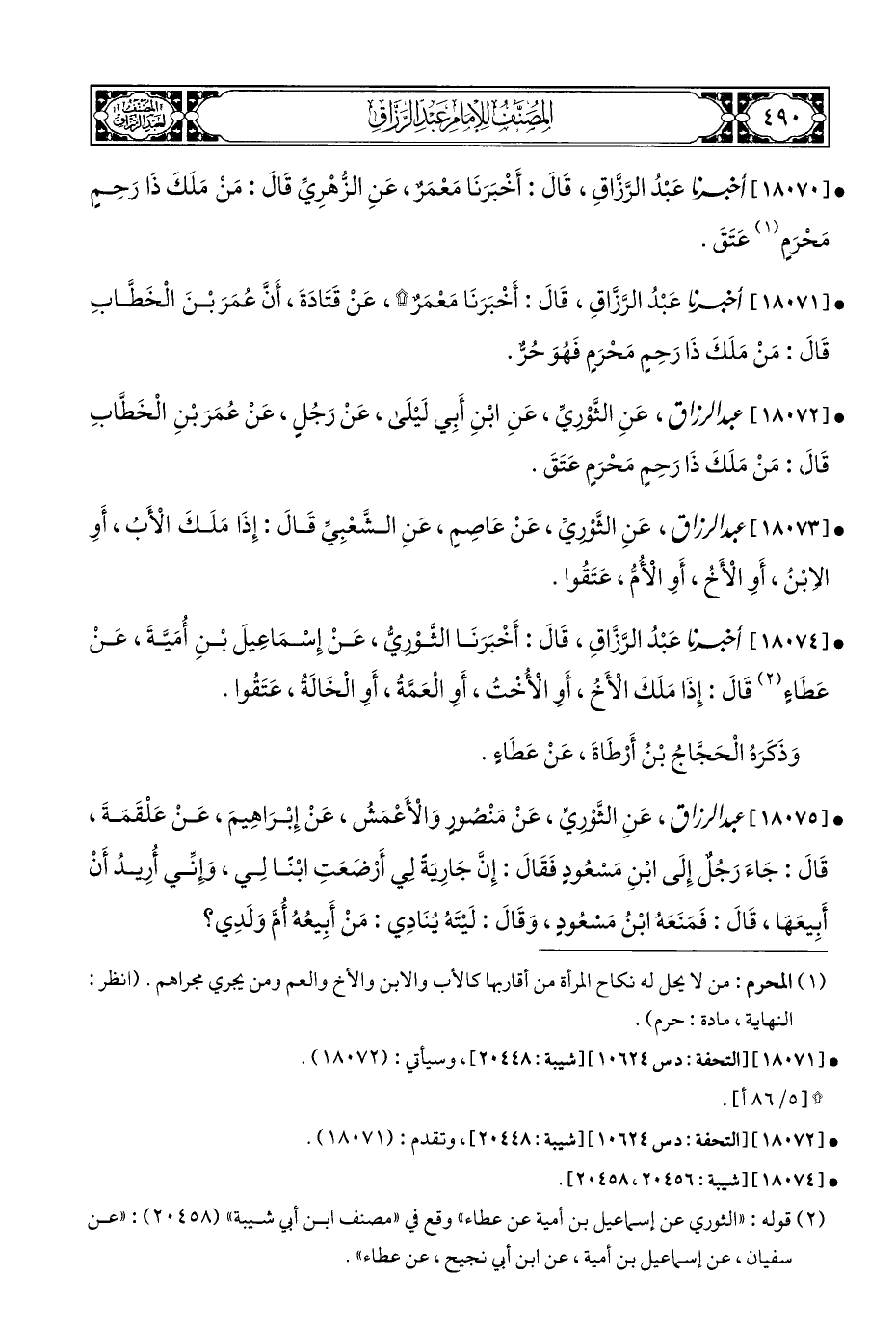 • [١٨٠٧٠] أخبرنا عَبْدُ الرَّزَّاقِ، قَالَ: أَخْبَرَنَا مَعْمَرٌ، عَنِ الزُّهْرِيِّ قَالَ: مَنْ مَلَكَ ذَا رَحِمٍ مَحْرَمٍ (¬١) عَتَقَ.