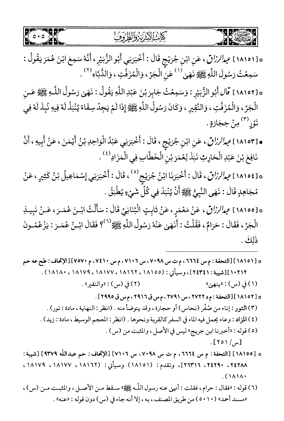 ° [١٨١٥١] عبد الرزاق، عَنِ ابْنِ جُرَيْجٍ قَالَ: أَخْبَرَنِي أَبُو الزُّبَيْرِ، أَنَّهُ سَمِعَ ابْنَ عُمَرَ يَقُولُ: سَمِعْتُ رَسُولَ اللهِ - صلى الله عليه وسلم - نهَى (¬١) عَنِ الْجَرِّ، وَالْمُزَفَّتِ، وَالدُّبَّاءِ (¬٢).