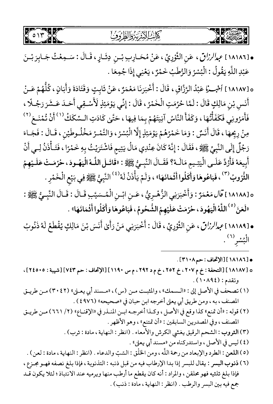 ° [١٨١٨٧] عَبْدُ الرَّزَّاقِ، قَالَ: أَخْبَرَنَا مَعْمَرٌ، عَنْ ثَابِتٍ وَقَتَادَةَ وَأَبَانٍ، كُلُّهُمْ عَنْ أَنَسِ بْنِ مَالِكٍ قَالَ: لَمَّا حُرِّمَتِ الْخَمْر، قَالَ: إِنِّي يَوْمَئِذٍ لأَسْقِي أَحَدَ عَشَرَ رَجُلًا، فَأَمَرُونِي فَكَفَأْتُهَا، وَكَفَأَ النَّاسُ آنِيَتَهُمْ بِمَا فِيهَا، حَتَّى كَادَتِ السِّكَكُ (¬١) أَنْ تُمْنَعَ (¬٢) مِنْ رِيِحهَا، قَالَ أَنَسٌ: وَمَا خَمْرُهُمْ يَوْمَئِذٍ إِلَّا الْبُسْرُ، وَالتَّمْرُ مَخْلُوطَيْنِ، قَالَ: فَجَاءَ رَجُلٌ إِلَى النَّبِيِّ - صلى الله عليه وسلم -، فَقَالَ: إِنَّهُ كَانَ عِنْدِي مَالُ يَتِيمٍ فَاشْتَرَيْتُ بِهِ خَمْرًا، فَتَأْذَنُ لِي أَنْ أَبِيعَهُ فَأَرُدَّ عَلَى الْيَتِيمِ مَالَهُ؟ فَقَالَ النَّبِيُّ - صلى الله عليه وسلم -: "قَاتَلَ اللَّهُ الْيَهُودَ، حُرِّمَتْ عَلَيْهِمُ الثُّرُوبُ (¬٣)، فَبَاعُوهَا وَأَكَلُوا أَثْمَانَهَا"، وَلَمْ يَأْذَنْ لَهُ (¬٤) النَّبِيُّ - صلى الله عليه وسلم - في بَيْعِ الْخَمْرِ.