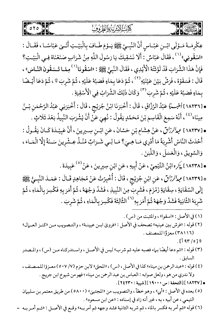 ° [١٨٢٣٩] عبد الرزاق، عَنِ ابْنِ جُرَيْجٍ، قَالَ: أُخْبِرْتُ عَنْ مُجَاهِدٍ قَالَ: عَمَدَ النَّبِيُّ - صلى الله عليه وسلم - إِلَى السِّقَايَةِ، سِقَايَةِ زَمْزَمَ، فَشَرِبَ مِنَ النَّبِيذِ، فَشَدَّ وَجْهَه، ثُمَّ أَمَرَ بِهِ فَكُسِرَ بِالْمَاءِ، ثُمَّ شَرِبَهُ الثَّانِيَةَ فَشَدَّ وَجْهَهُ ثُمَّ أَمَرَ بِهِ (¬٦) الثَّالِثَةَ فَكُسِرَ بِالْمَاءِ، ثُمَّ شَرِبَ.
