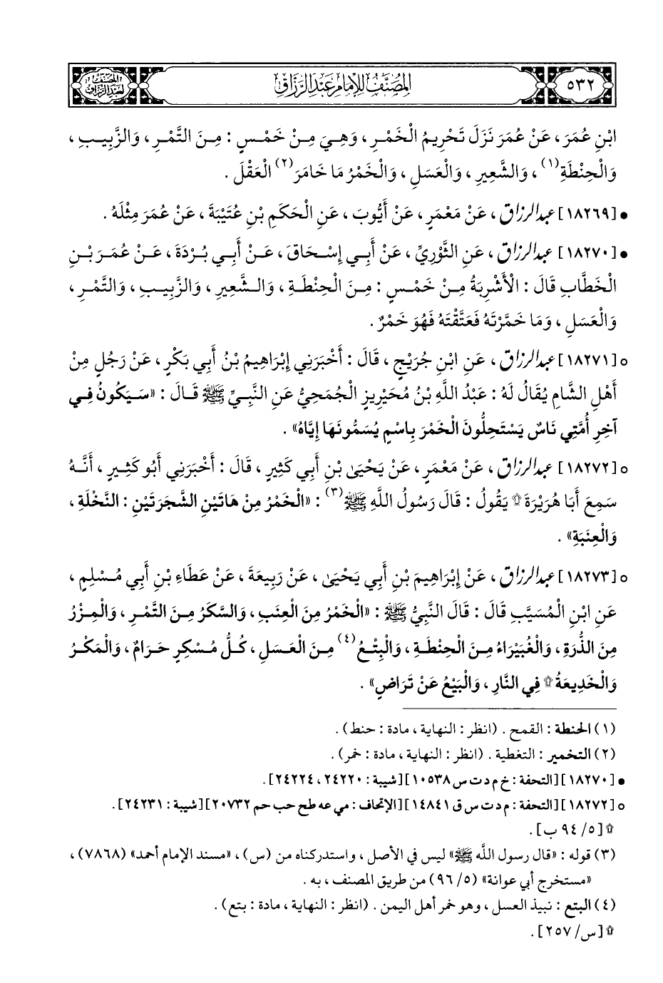 ° [١٨٢٧١] عبد الرزاق، عَنِ ابْنِ جُرَيْجٍ، قَالَ: أَخْبَرَنِي إِبْرَاهِيمُ بْنُ أَبِي بَكْرٍ، عَنْ رَجُلٍ مِنْ أَهْلِ الشَّامِ يُقَالُ لَهُ: عَبْدُ اللهِ بْنُ مُحَيْرِيزٍ الْجُمَحِيُّ عَنِ النَّبِيِّ - صلى الله عليه وسلم - قَالَ: "سَيَكُونُ فِي آخِرِ أُمَّتِي نَاسٌ يَسْتَحِلُّونَ الْخَمْرَ بِاسْمٍ يُسَمُّونَهَا إِيَّاهُ".