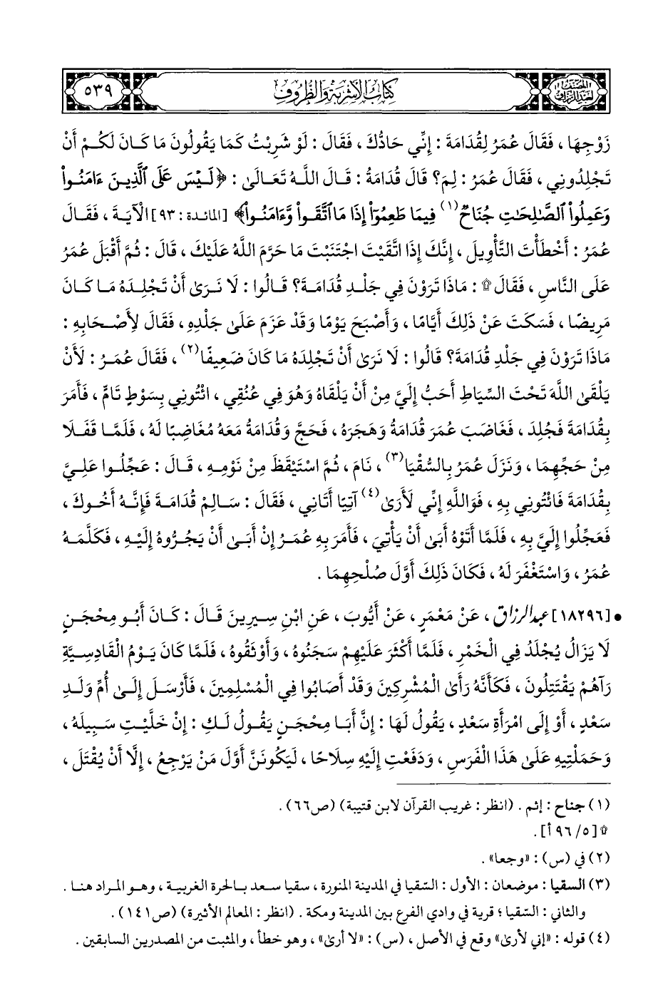 زَوْجِهَا، فَقَالَ عُمَرُ لِقُدَامَةَ: إِنِّي حَادُّكَ، فَقَالَ: لَوْ شَرِبْتُ كَمَا يَقُولُونَ مَا كَانَ لكمْ أَنْ تَجْلِدُونِي، فَقَالَ عُمَرُ: لِمَ؟ قَالَ قُدَامَةُ: قَالَ اللَّهُ تَعَالَى: {لَيْسَ عَلَى الَّذِينَ آمَنُوا وَعَمِلُوا الصَّالِحَاتِ جُنَاحٌ (¬١) فِيمَا طَعِمُوا إِذَا مَا اتَّقَوْا وَآمَنُوا} [المائدة: ٩٣] الآيَةَ، فَقَالَ عُمَرُ: أَخْطَأْتَ التَّأْوِيلَ، إِنَّكَ إِذَا اتَّقَيْتَ اجْتَنَبْتَ مَا حَرَّمَ اللَّهُ عَلَيْكَ، قَالَ: ثُمَّ أَقْبَلَ عُمَرُ عَلَى النَّاسِ، فَقَالَ *: مَاذَا تَرَوْنَ فِي جَلْدِ قُدَامَةَ؟ قَالُوا: لَا نَرَى أَنْ تَجْلِدَهُ مَا كَانَ مَرِيضًا، فَسَكَتَ عَنْ ذَلِكَ أَيامًا، وَأَصْبَحَ يَوْمًا وَقَدْ عَزَمَ عَلَى جَلْدِهِ، فَقَالَ لِأَصْحَابِهِ: مَاذَا تَرَوْن فِي جَلْدِ قُدَامَةَ؟ قَالُوا: لَا نَرَى أَنْ تَجْلِدَهُ مَا كَانَ ضَعِيفًا (¬٢)، فَقَالَ عُمَرُ: لأَنْ يَلْقَى اللَّهَ تَحْتَ السِّيَاطِ أَحَبُّ إِليَّ مِنْ أَنْ يَلْقَاهُ وَهُوَ فِي عُنُقِي، ائْتُونِي بِسَوْطٍ تَامٍّ، فَأَمَرَ بِقُدَامَةَ فَجُلِدَ، فَغَاضَبَ عُمَرَ قُدَامَةُ وَهَجَرَه، فَحَجَّ وَقُدَامَةُ مَعَهُ مُغَاضِبًا لَه، فَلَمَّا قَفَلَا مِنْ حَجِّهِمَا، وَنَزَلَ عُمَرُ بِالسُّقْيَا (¬٣)، نَامَ، ثُمَّ اسْتَيْقَظَ مِنْ نَوْمِهِ، قَالَ: عَجِّلوا عَلِيَّ بِقُدَامَةَ فَائْتُونِي بِهِ، فَوَاللهِ إِنِّي لأَرَى (¬٤) آتِيًا أَتَانِي، فَقَالَ: سَالِمْ قُدَامَةَ فَإِنَّهُ أَخُوكَ، فَعَجِّلُوا إِلَيَّ بِهِ، فَلَمَّا أَتَوْهُ أَبَى أَنْ يَأْتِيَ، فَأَمَرَ بِهِ عُمَرُ إِنْ أَبَى أَنْ يَجُرُّوهُ إِلَيْهِ، فَكَلَّمَهُ عُمَر، وَاسْتَغْفَرَ لَه، فَكَانَ ذَلِكَ أَوَّلَ صُلْحِهِمَا.