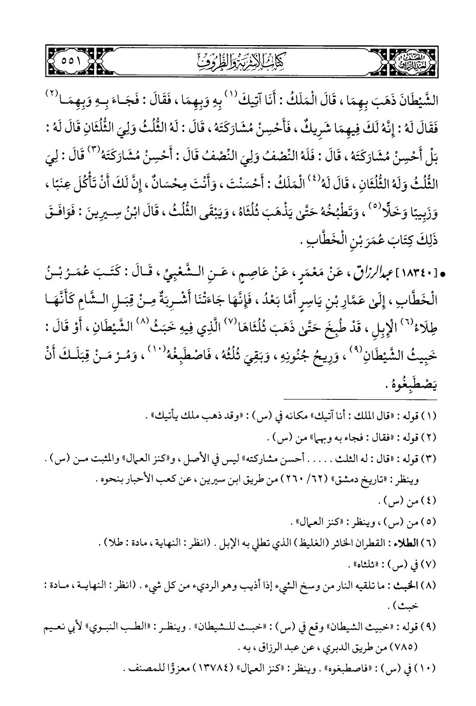 الشَّيْطَانَ ذَهَبَ بِهِمَا، قَالَ الْمَلَكُ: أَنَا آتِيكَ (¬١) بِهِ وَبِهِمَا، فَقَالَ: فَجَاءَ بِهِ وَبِهِمَا (¬٢) فَقَالَ لَهُ: إِنَّهُ لَكَ فِيهِمَا شَرِيكٌ، فَأَحْسِنْ مُشَارَكَتَهُ، قَالَ: لَهُ الثُّلُثُ وَلِيَ الثُّلُثَانِ قَالَ لَهُ: بَلْ أَحْسِنْ مُشَارَكَتَهُ، قَالَ: فَلَهُ النِّصْفُ وَلِيَ النِّصفُ قَالَ: أَحْسِنْ مُشَارَكَتَهُ (¬٣) قَالَ: لِيَ الثُّلُثُ وَلَهُ الثُّلُثَانِ، قَالَ لَهُ (¬٤) الْمَلَكُ: أَحْسَنْتَ، وَأَنْتَ مِحْسَانٌ، إِنَّ لَكَ أَنْ تَأْكُلَ عِنَبًا، وَزَبِيبًا وَخَلًّا (¬٥)، وَتَطْبُخُهُ حَتَّى يَذْهَبَ ثُلُثَاهُ، وَيَبْقَى الثُّلُثُ، قَالَ ابْنُ سِيرِينَ: فَوَافَقَ ذَلِكَ كِتَابَ عُمَرَ بْنِ الْخَطَّابِ.