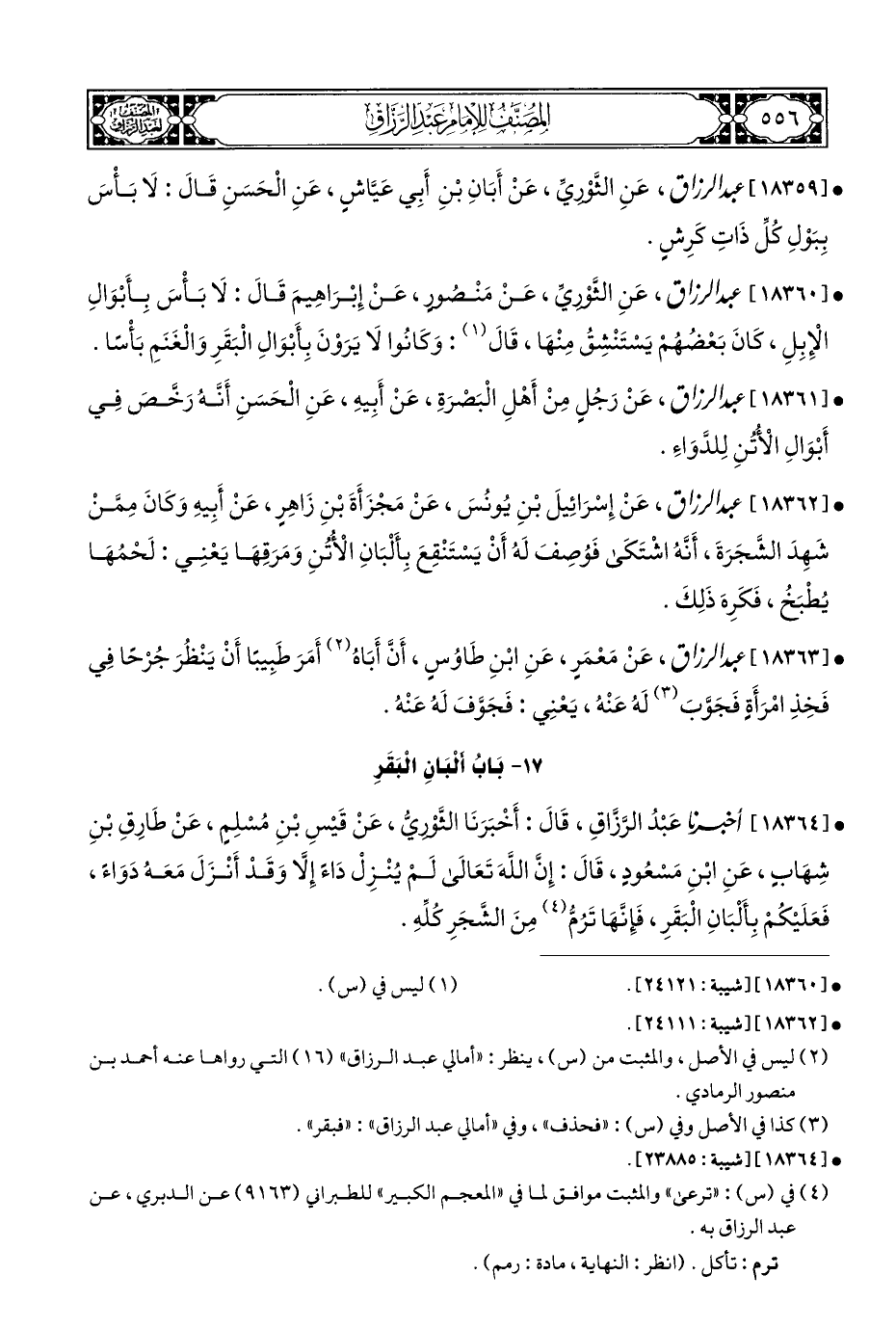 • [١٨٣٦٤] أَخْبَرَنَا عَبْدُ الرَّزَّاقِ، قَالَ: أَخْبَرَنَا الثَّوْرِيُّ، عَنْ قَيْسِ بْنِ مُسْلِمٍ، عَنْ طَارِقِ بْنِ شِهَابٍ، عَنِ ابْنِ مَسْعُودٍ، قَالَ: إِنَّ اللَّهَ تَعَالَى لَمْ يُنْزِلْ دَاءً إِلَّا وَقَدْ أَنْزَلَ مَعَهُ دَوَاءً، فَعَلَيْكُمْ بِأَلْبَانِ الْبَقَرِ، فَإِنَّهَا تَرُمُّ (¬٤) مِنَ الشَّجَرِ كُلِّهِ.