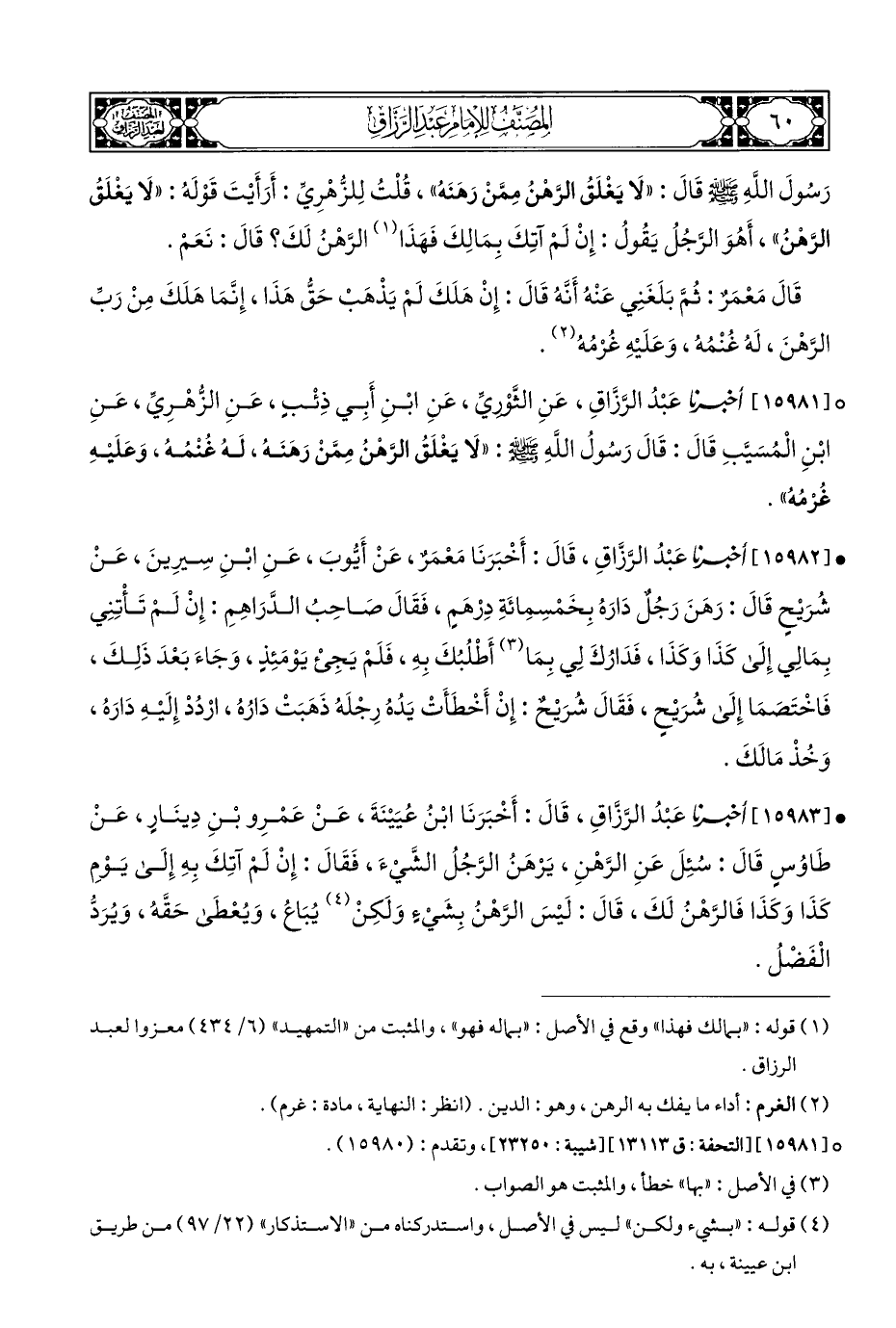 ° [١٥٩٨١] أخبرنا عَبْدُ الرَّزَّاقِ، عَنِ الثَّوْرِيِّ، عَنِ ابْنِ أَبِي ذِئْبٍ، عَنِ الزُّهْرِيِّ، عَنِ ابْنِ الْمُسَيَّبِ قَالَ: قَالَ رَسُولُ اللهِ - صلى الله عليه وسلم -: "لَا يَغْلَقُ الرَّهْنُ مِمَّنْ رَهَنَه، لَهُ غُنْمُه، وَعَلَيْهِ غُرْمُهُ".