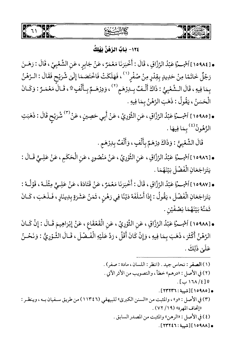 • [١٥٩٨٤] أخبرنا عَبْدُ الرَّزَّاقِ، قَالَ: أَخْبَرَنَا مَعْمَرٌ، عَنْ جَابِرٍ، عَنِ الشَّعْبِيِّ، قَالَ: رَهَنَ رَجُلٌ خَاتَمًا مِنْ حَدِيدٍ بِقِدرٍ مِن صُفْرٍ (¬١)، فهَلكَتْ فَاخْتَصَمَا إِلي شُرَيْحٍ فَقَال: الرَّهْنُ بِمَا فِيهِ، قَالَ الشَّعْبِيُّ: ذَاكَ أَلْفٌ بِدِرْهَمٍ (¬٢)، وَدِرْهَمٌ بِأَلْفٍ *، قَالَ مَعْمَرٌ: وَكَانَ الْحَسَن، يَقُولُ: ذَهَبَ الرَّهْنُ بِمَا فِيهِ.