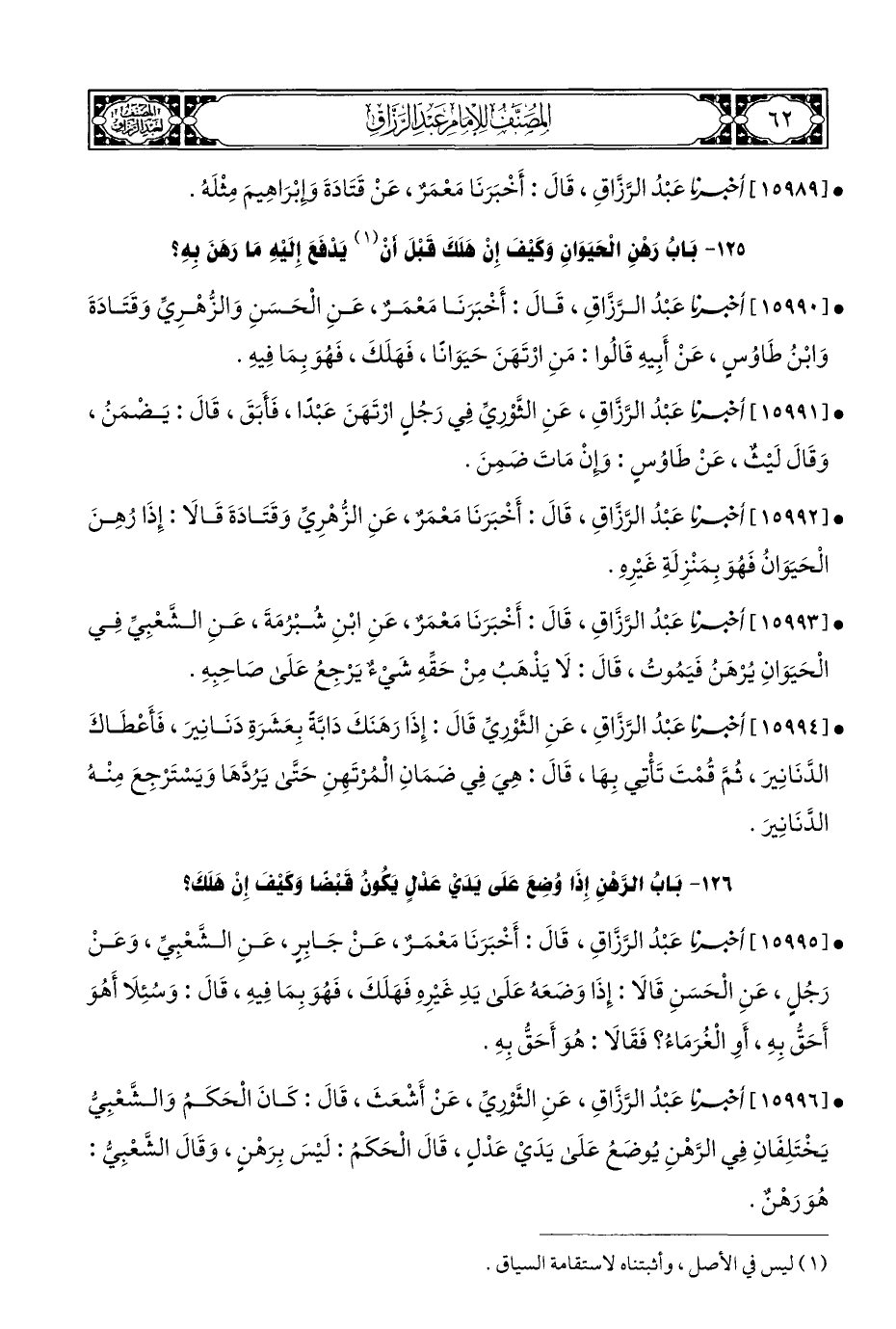 • [١٥٩٩٢] أخبرنا عَبْدُ الرَّزَّاقِ، قَالَ: أَخْبَرَنَا مَعْمَرٌ، عَنِ الزُّهْرِيِّ وَقَتَادَةَ قَالَا: إِذَا رُهِنَ الْحَيَوَانُ فَهُوَ بِمَنْزِلَةِ غَيْرِهِ.