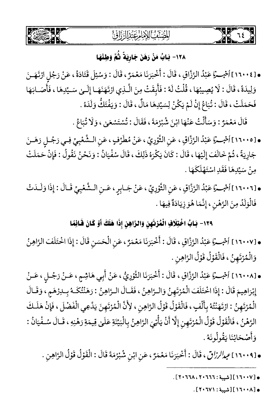 • [١٦٠٠٤] أخبرنا عَبْدُ الرَّزَّاقِ، قَالَ: أَخْبَرَنَا مَعْمَرٌ، قَالَ: وَسُئِلَ قَتَادَة، عَنْ رَجُلٍ ارْتَهَنَ وَلِيدَةً، قَالَ: لَا يُصِيبُهَا، قُلْتُ لَهُ: فَأَبِقَتْ مِنَ الَّذِي ارْتَهَنَهَا إِلَى سَيِّدِهَا، فَأَصَابَهَا فَحَمَلَتْ، قَالَ: تُبَاعُ إِنْ لَمْ يَكُنْ لِسَيِّدِهَا مَالٌ، قَالَ: وَيَفْتَكُّ وَلَدَهُ.
