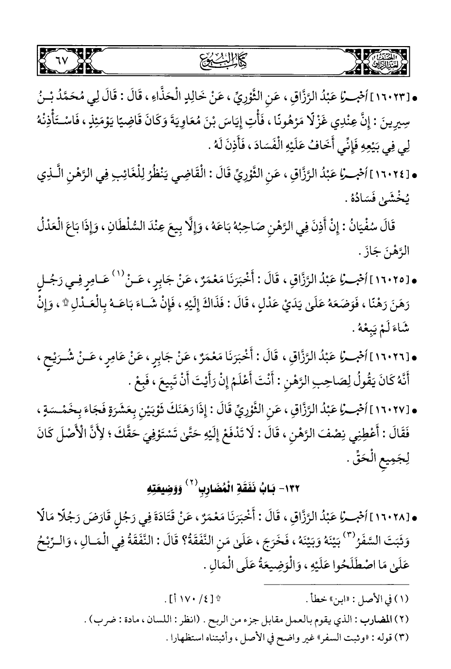 • [١٦٠٢٨] أخبرنا عَبْدُ الرَّزَّاقِ، قَالَ: أَخْبَرَنَا مَعْمَرٌ، عَنْ قَتَادَةَ فِي رَجُلٍ قَارَضَ رَجُلًا مَالًا وَثَبَتَ السَّفَرُ (¬٣) بَيْنَهُ وَبَيْنَه، فَخَرَجَ، عَلَى مَنِ النَّفَقَةُ؟ قَالَ: النَّفَقَةُ فِي الْمَالِ، وَالرِّبْحُ عَلَى مَا اصطَلَحُوا عَلَيْهِ، وَالْوَضِيعَةُ عَلَى الْمَالِ.