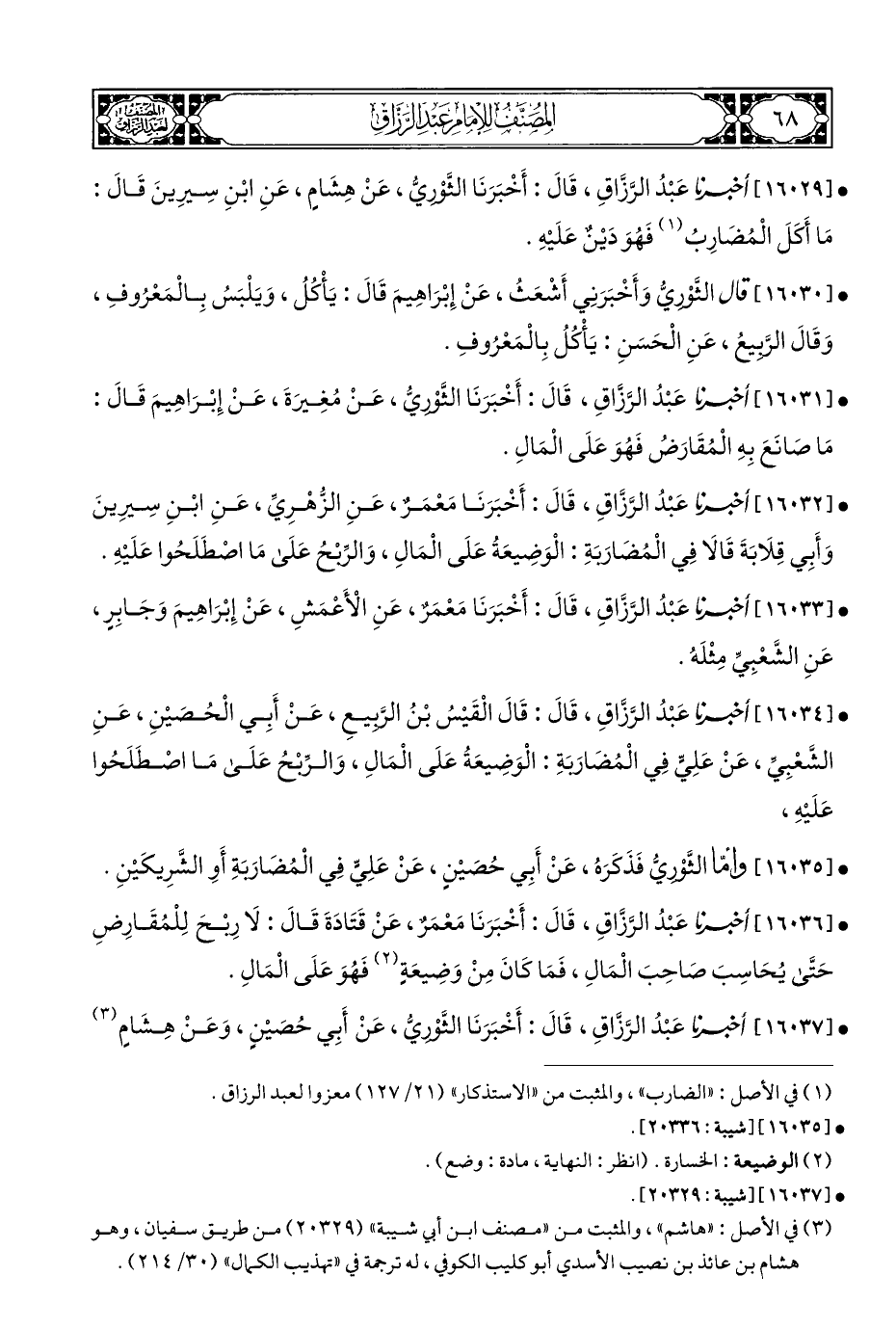 • [١٦٠٣٧] أخبرنا عَبْدُ الرَّزَّاقِ، قَالَ: أَخْبَرَنَا الثَّوْرِيُّ، عَنْ أَبِي حُصَيْنٍ، وَعَنْ هِشَامِ (¬٣)