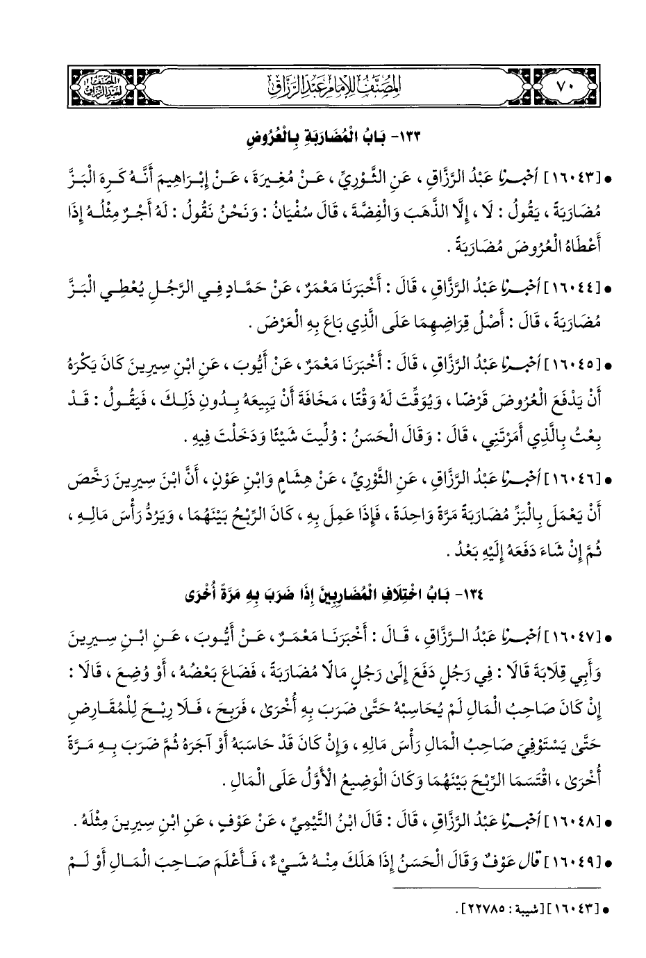 • [١٦٥٤٣] أخبرنا عَبْدُ الرَّزَّاقِ، عَنِ الثَّوْرِيِّ، عَنْ مُغِيرَةَ، عَنْ إِبْرَاهِيمَ أَنَّهُ كَرِهَ الْبَزَّ مُضَارَبَةً، يَقُولُ: لَا، إِلَّا الذَّهَبَ وَالْفِضَّةَ، قَالَ سُفْيَانُ: وَنَحْنُ نَقُولُ: لَهُ أَجْرٌ مِثْلُهُ إِذَا أَعْطَاهُ الْعُرُوضَ مُضَارَبَةً.