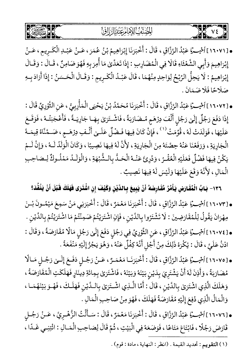 • [١٦٠٧٦] أخبرنا عَبْدُ الرَّزَّاقِ، قَالَ: أَخْبَرَنَا مَعْمَرٌ، قَالَ: سَأَلْتُ الزُّهْرِيَّ، عَنْ رَجُلٍ قَارَضَ رَجُلًا، فَابْتَاعَ مَتَاعًا، فَوَضَعَهُ فِي الْبَيْتِ، ثُمَّ قَالَ لِصاحِبِ الْمَالِ: ائْتِنِي غَدًا،