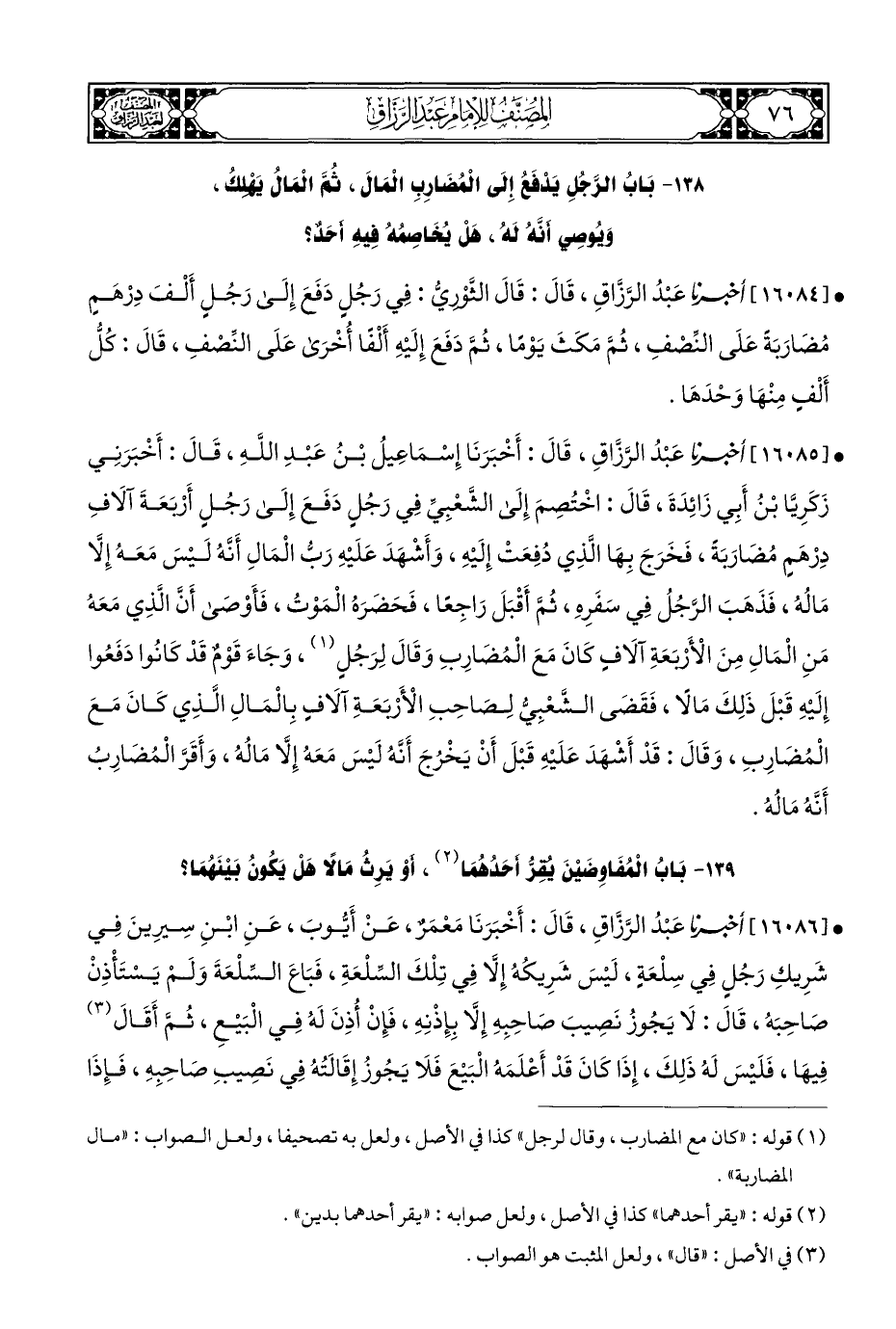• [١٦٠٨٥] أخبرنا عَبْدُ الرَّزَّاقِ، قَالَ: أَخْبَرَنَا إِسْمَاعِيلُ بْنُ عَبْدِ اللهِ، قَالَ: أَخْبَرَنِي زَكَرِيَّا بْنُ أَبِي زَائِدَةَ، قَالَ: اخْتُصِمَ إِلَى الشَّعْبِيِّ فِي رَجُلٍ دَفَعَ إِلَي رَجُلٍ أَرْبَعَةَ آلَافِ دِرْهَمِ مُضَارَبَةً، فَخَرَجَ بِهَا الَّذِي دُفِعَتْ إِلَيْهِ، وَأَشْهَدَ عَلَيْهِ رَبُّ الْمَالِ أَنَّهُ لَيْسَ مَعَهُ إِلَّا مَالُه، فَذَهَبَ الرَّجُلُ فِي سَفَرِهِ، ثُمَّ أَقْبَلَ رَاجِعًا، فَحَضَرَهُ الْمَوْت، فَأَوْصَى أَنَّ الَّذِي مَعَهُ مَنِ الْمَالِ مِنَ الْأَرْبَعَةِ آلَافٍ كَانَ مَعَ الْمُضَارِبِ وَقَالَ لِرَجُلٍ (¬١)، وَجَاءَ قَوْمٌ قَدْ كَانُوا دَفَعُوا إِلَيْهِ قَبْلَ ذَلِكَ مَالًا، فَقَضَى الشَّعْبِيُّ لِصَاحِبِ الْأَرْبَعَةِ آلَافِ بِالْمَالِ الَّذِي كَانَ مَعَ الْمُضَارِبِ، وَقَالَ: قَدْ أَشْهَدَ عَلَيْهِ قَبْلَ أَنْ يَخْرُجَ أَنَّهُ لَيْسَ مَعَهُ إِلَّا مَالُه، وَأَقَرَّ الْمُضارِبُ أَنَّهُ مَالُهُ.
