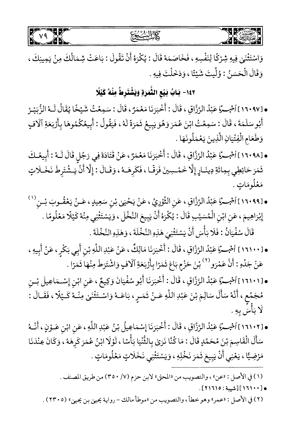 • [١٦١٠١]، أخبرنا عَبْدُ الرَّزَّاقِ، قَالَ: أَخْبَرَنَا أَبُو سُفْيَانَ وَكِيعٌ، عَنِ ابْنِ إِسْماعِيلَ بْنِ مُجَمِّعٍ، أَنَّهُ سَأَلَ سَالِمَ بْنَ عَبْدِ اللهِ عَنْ ثَمَرٍ، بَاعَهُ وَاسْتَثْنَى مِنْهُ كَيْلًا، فَقَالَ: لَا بَأْسَ بِهِ.