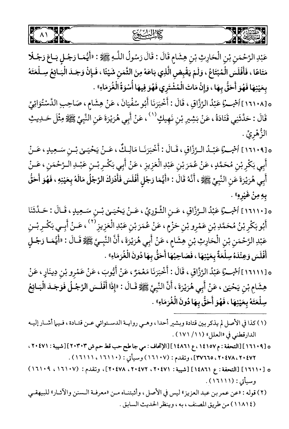 ° [١٦١٠٩] أخبرنا عَبْدُ الرَّزَّاقِ، قَالَ: أَخْبَرَنَا مَالكٌ، عَنْ يَحْيَى بْنِ سَعِيدٍ، عَنْ أَبِي بَكْرِ بْنِ مُحَمَّدٍ، عَنْ عُمَرَ بْنِ عَبْدِ الْعَزِيزِ، عَنْ أَبِي بَكْرِ بْنِ عَبْدِ الرَّحْمَنِ، عَنْ أَبِي هُرَيْرَةَ عَنِ النَّبِيِّ - صلى الله عليه وسلم -، أَنَّهُ قَالَ: "أَيُّمَا رَجُلٍ أَفْلَسَ فَأَدْرَكَ الرَّجُلُ مَالَهُ بِعَيْنِهِ، فَهُوَ أَحَقُّ بِهِ مِنْ غَيْرِهِ".