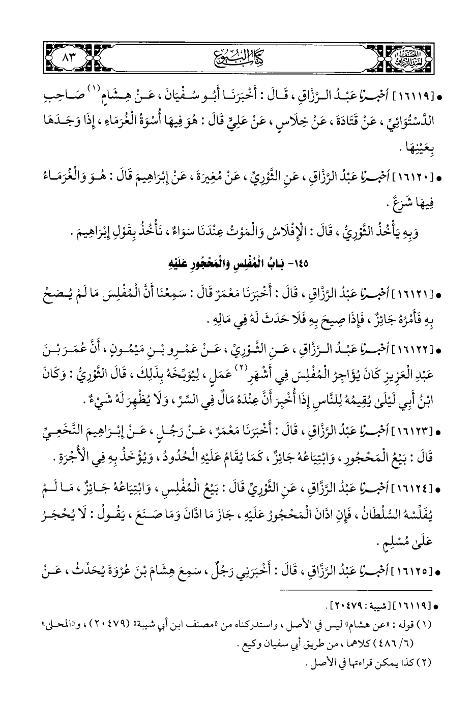 • [١٦١٢٤] أخبرنا عَبْدُ الرَّزَّاقِ، عَنِ الثَّوْريِّ قَالَ: بَيْعُ الْمُفْلِسِ، وَابْتِيَاعُهُ جَائِزٌ، مَا لَمْ يُفَلِّسْهُ السُّلْطَان، فَإِنِ ادَّانَ الْمَحْجُورُ عَلَيْهِ، جَازَ مَا ادَّانَ وَمَا صَنَعَ، يَقُولُ: لَا يُحْجَرُ عَلَي مُسْلِمٍ.