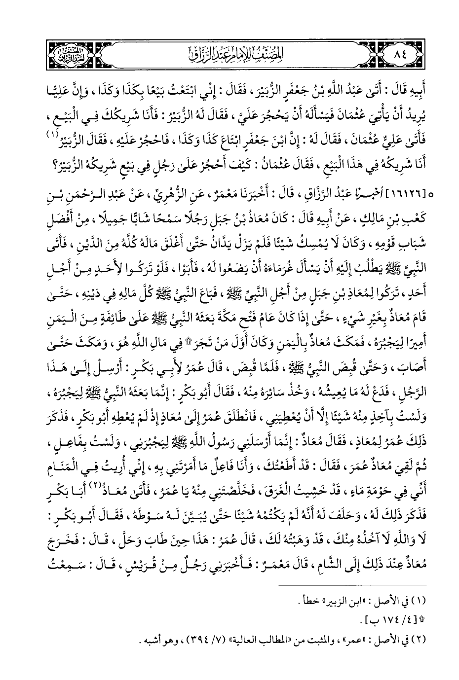 ° [١٦١٢٦] أخبرنا عَبْدُ الرَّزَّاقِ، قَالَ: أَخْبَرَنَا مَعْمَرٌ، عَنِ الزُّهْرِيِّ، عَنْ عَبْدِ الرَّحْمَنِ بْنِ كَعْبِ بْنِ مَالِكٍ، عَنْ أَبِيهِ قَالَ: كَانَ مُعَاذُ بْنُ جَبَلٍ رَجُلًا سَمْحًا شَابًّا جَمِيلًا، مِنْ أَفْضَلِ شَبَابِ قَوْمِهِ، وَكَانَ لَا يُمْسِكُ شَيْئًا فَلَمْ يَزَلْ يَدَّانُ حَتَّى أَغْلَقَ مَالَهُ كُلَّهُ مِنَ الدَّيْنِ، فَأَتَى النَّبِيَّ - صلى الله عليه وسلم - يَطْلُبُ إِلَيْهِ أَنْ يَسْأَلَ غُرَمَاءَهُ أَنْ يَضَعُوا لَه، فَأَبَوْا، فَلَوْ تَرَكُوا لِأَحَدٍ مِنْ أَجْلِ أَحَدٍ، تَرَكُوا لِمُعَاذِ بْنِ جَبَلٍ مِنْ أَجْلِ النَّبِيِّ - صلى الله عليه وسلم -، فَبَاعَ النَّبِيُّ - صلى الله عليه وسلم - كُلَّ مَالِهِ فِي دَيْنِهِ، حَتَّى قَامَ مُعَاذٌ بِغَيْرِ شَيءٍ، حَتَّى إِذَا كَانَ عَامُ فَتْحِ مَكَّةَ بَعَثَهُ النَّبِي - صلى الله عليه وسلم - علَي طَائِفَةٍ مِنَ الْيَمَنِ أَمِيرًا لِيَجْبُرَه، فَمَكَثَ مُعَاذٌ بِالْيَمَنِ وَكَانَ أَوَّلَ مَنْ تَجَرَ * فِي مَالِ اللهِ هُوَ، وَمَكَثَ حَتَّى أَصَابَ، وَحَتَّى قُبِضَ النَّبِيُّ - صلى الله عليه وسلم -، فَلَمَّا قُبِضَ، قَالَ عُمَرُ لِأَبِي بَكْرٍ: أَرْسِلْ إِلَي هَذَا الرَّجُلِ، فَدَعْ لَهُ مَا يُعِيشُه، وَخُذْ سَائِرَهُ مِنْه، فَقَالَ أَبُو بَكْرٍ: إِنَّمَا بَعَثَهُ النَّبِيُّ - صلى الله عليه وسلم - لِيَجْبُرَه، وَلَسْتُ بِآخِذٍ مِنْهُ شَيْئًا إِلَّا أَنْ يُعْطِيَنِي، فَانْطَلَقَ عُمَرُ إِلَي مُعَاذٍ إِذْ لَمْ يُعْطِهِ أَبُو بَكْرٍ، فَذَكَرَ ذَلِكَ عُمَرُ لِمُعَاذٍ، فَقَالَ مُعَاذٌ: إِنَّمَا أَرْسَلَنِي رَسُولُ اللهِ - صلى الله عليه وسلم - لِيَجْبُرَنِي، وَلَسْتُ بِفَاعِلٍ، ثُمَّ لَقِيَ مُعَاذٌ عُمَرَ، فَقَالَ: قَدْ أَطَعْتُكَ، وَأَنَا فَاعِلٌ مَا أَمَرْتَنِي بِهِ، إِنِّي أُرِيتُ فِي الْمَنَامِ أَنِّي فِي حَوْمَةِ مَاءً، قَدْ خَشِيتُ الْغَرَقَ، فَخَفَصْتَنِي مِنْهُ يَا عُمَر، فَأَتَى مُعَاذُ (¬٢) أَبَا بَكْرٍ فَذَكَرَ ذَلِكَ لَه، وَحَلَفَ لَهُ أَنَّهُ لَمْ يَكْتُمْهُ شَيْئًا حَتَّى يُبَيَّنَ لَهُ سَوْطَه، فَقَالَ أَبُو بَكْرٍ: لَا وَاللَّهِ لَا آخُذُهُ مِنْكَ، قَدْ وَهَبْتُهُ لَكَ، قَالَ عُمَرُ: هَذَا حِينَ طَابَ وَحَلَّ، قَالَ: فَخَرَجَ مُعَاذ عِنْدَ ذَلِكَ إِلَى الشَّامِ، قَالَ مَعْمَرٌ: فَأَخْبَرَنِي رَجُلٌ مِنْ قُرَيْشٍ، قَالَ: سَمِعْتُ