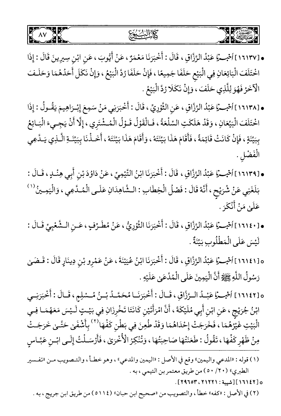° [١٦١٤١] أخبرنا عَبْدُ الرَّزَّاقِ، قَالَ: أَخْبَرَنَا ابْنُ عُيَيْنَةَ، عَنْ عَمْرِو بْنِ دِينَارٍ قَالَ: قَضَي رَسُولُ اللهِ - صلى الله عليه وسلم - أَنَّ الْيَمِينَ عَلَى الْمُدَّعَي عَلَيْهِ.