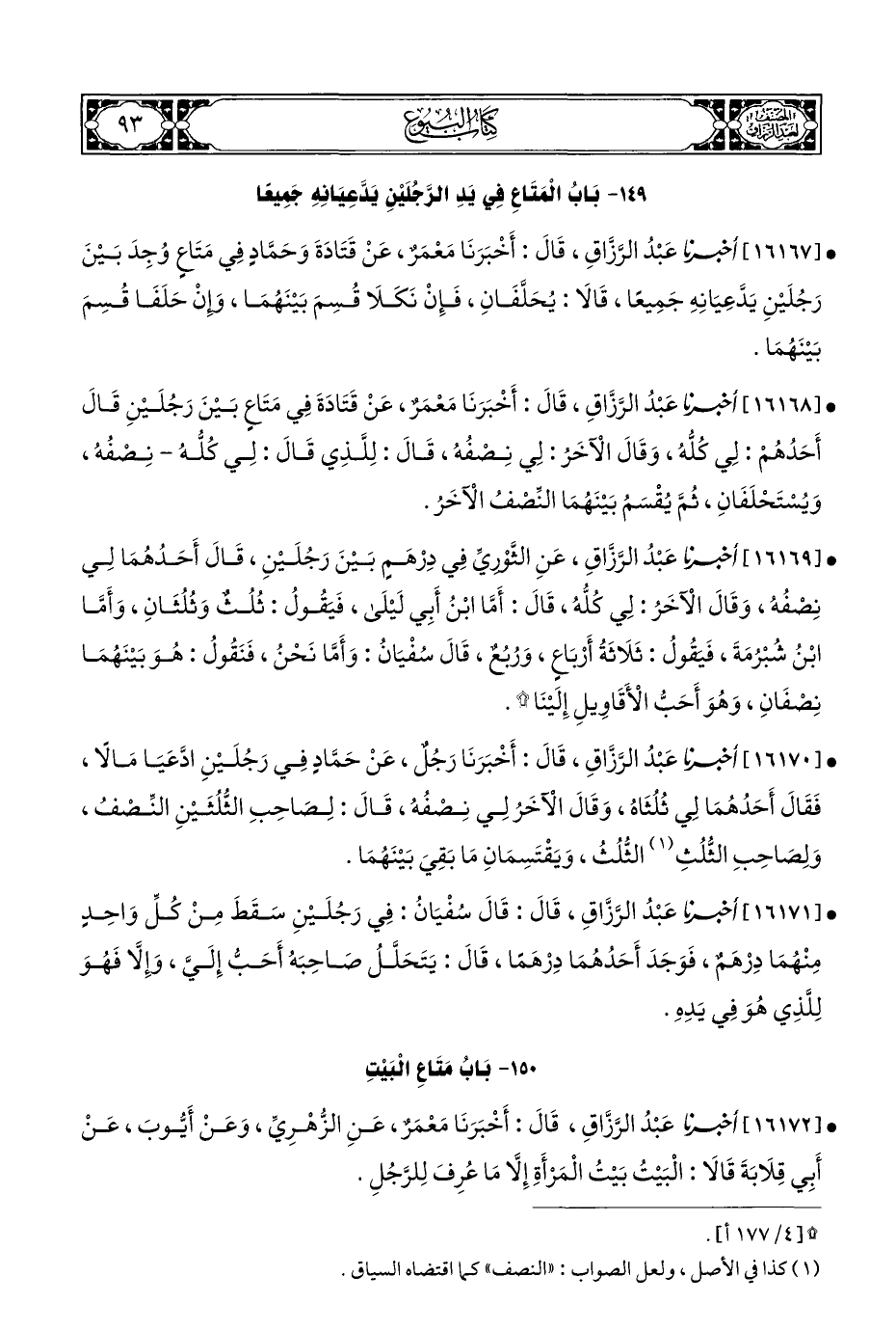 • [١٦١٦٩] أخبرنا عَبْدُ الرَّزَّاقِ، عَنِ الثَّوْرِيِّ فِي دِرْهَمٍ بيْنَ رَجُلَيْنِ، قَالَ أَحَدُهُمَا لِي نِصْفُه، وَقَالَ الْآخَرُ: لِي كُلُّه، قَالَ: أَمَّا ابْنُ أَبِي لَيْلَى، فَيَقُولُ: ثُلُثٌ وَثُلُثَانِ، وَأَمَّا ابْنُ شُبْرُمَةَ، فَيقُولُ: ثَلَاثَةُ أَرْبَاعٍ، وَرُبُعٌ، قَالَ سُفْيَانُ: وَأَمَّا نَحْنُ، فَنَقُولُ: هُوَ بَيْنَهُمَا نِصْفَانِ، وَهُوَ أَحَبُّ الْأَقَاوِيلِ إِلَيْنَا *.
