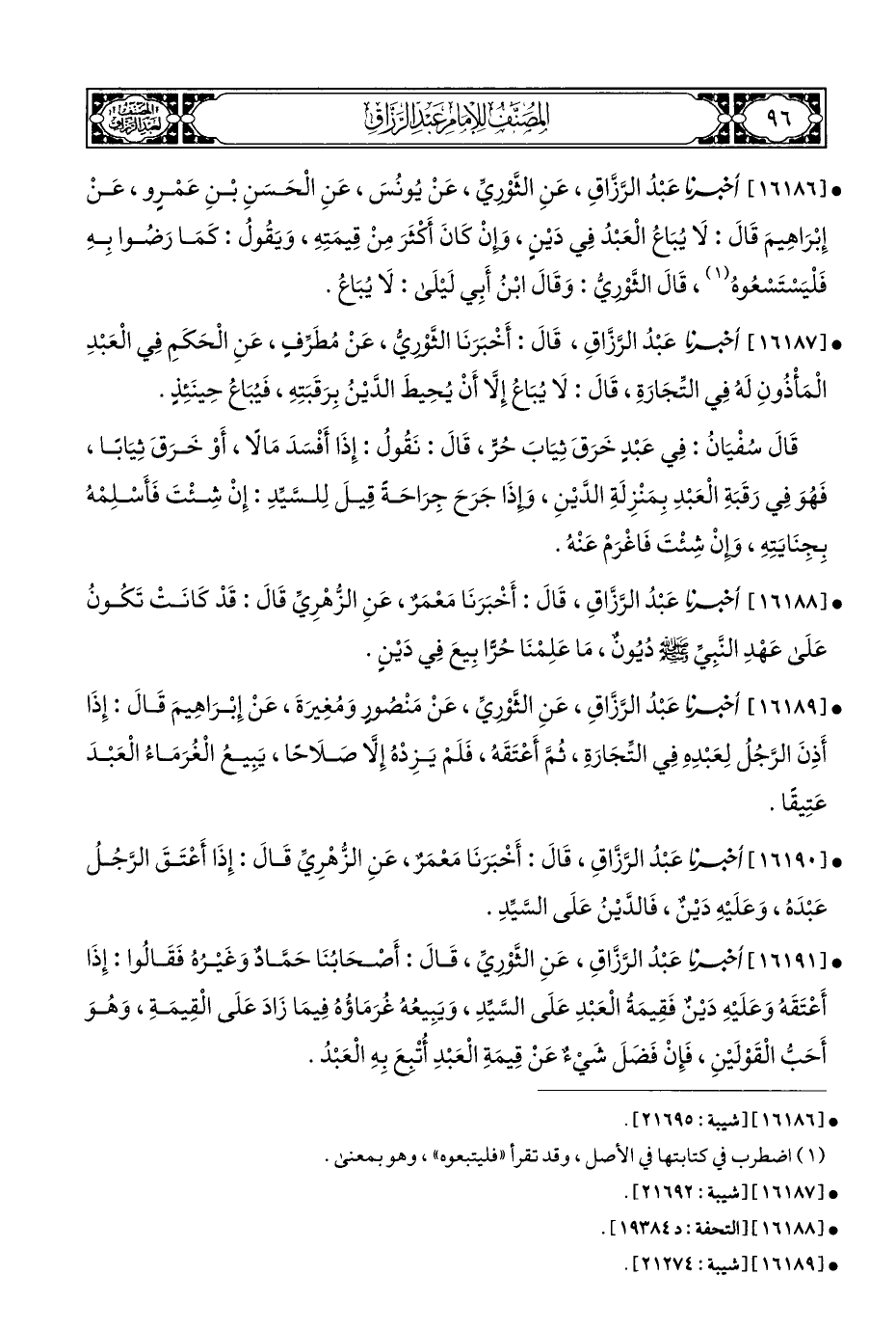 • [١٦١٩٠] أخبرنا عَبْدُ الرَّزَّاقِ، قَالَ: أَخْبَرَنَا مَعْمَرٌ، عَنِ الزُّهْرِيِّ قَالَ: إِذَا أَعْتَقَ الرَّجُلُ عَبْدَه، وَعَلَيْهِ دَيْنٌ، فَالدَّيْنُ عَلَى السَّيِّدِ.