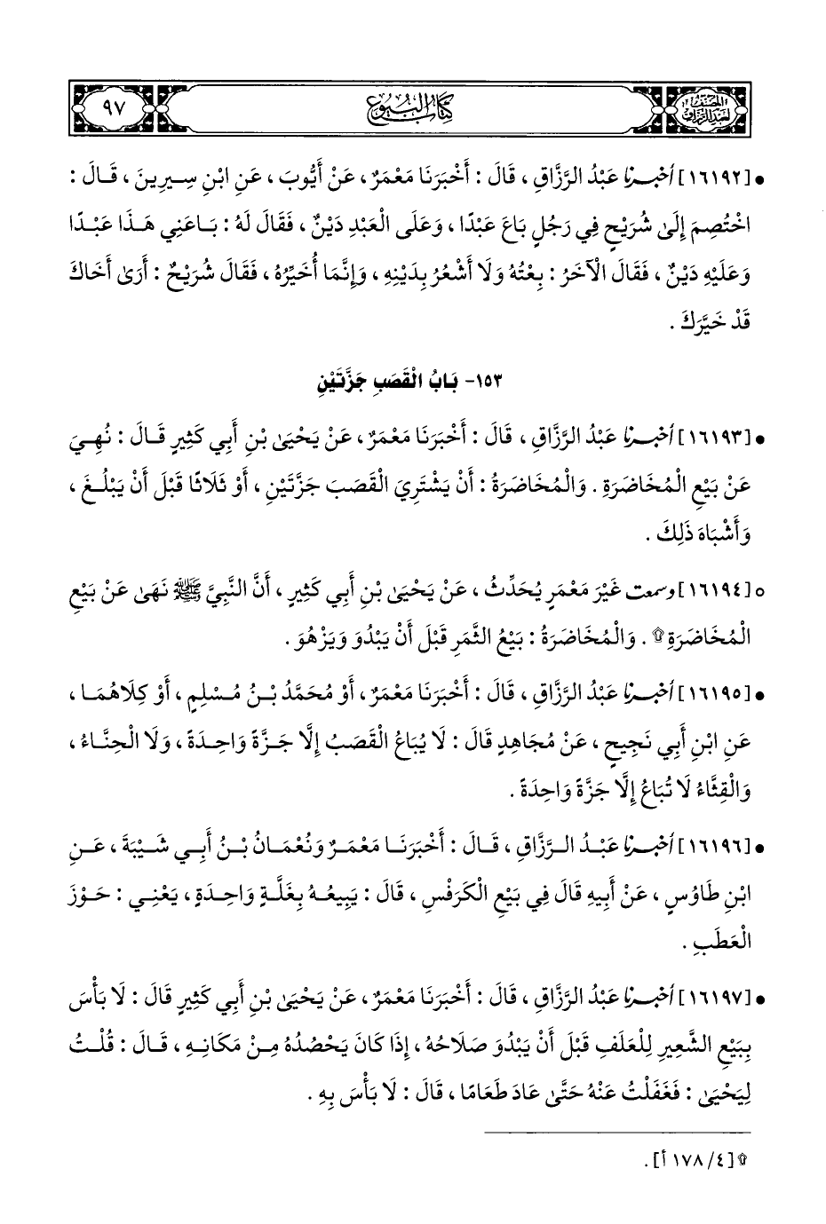 • [١٦١٩٥] أخبرنا عَبْدُ الرَّزَّاقِ، قَالَ: أَخْبَرَنَا مَعْمَرٌ، أَوْ مُحَمَّدُ بْنُ مُسْلِمٍ، أَوْ كِلَاهُمَا، عَنِ ابْنِ أَبِي نَجِيحٍ، عَنْ مُجَاهِدٍ قَالَ: لَا يُبَاعُ الْقَصَبُ إِلَّا جَزَّةً وَاحِدَةً، وَلَا الْحِنَّاءُ، وَالْقِثَّاءُ لَا تُبَاعُ إِلَّا جَزَّةً وَاحِدَةً.