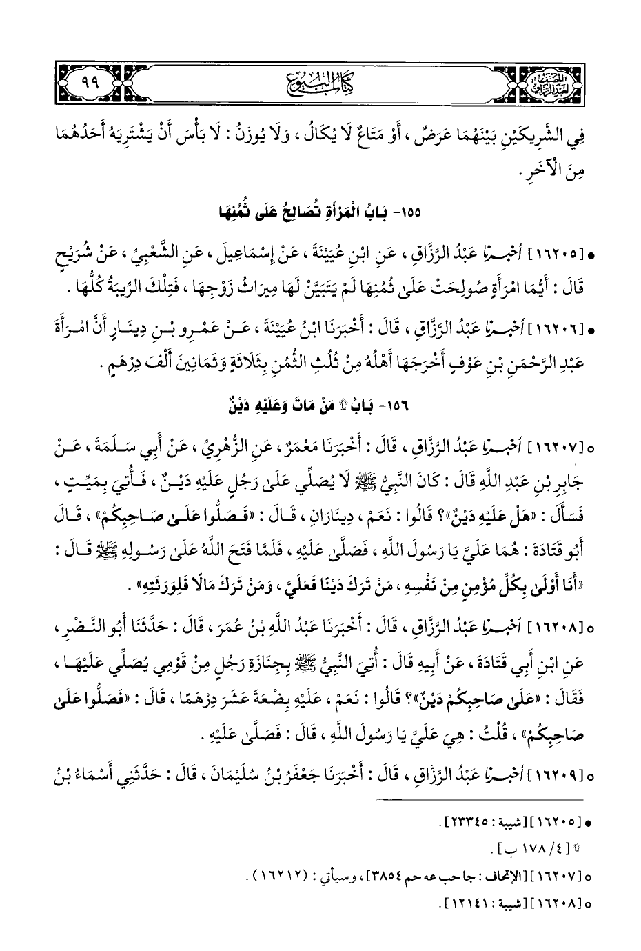 ° [١٦٢٠٧] أخبرنا عَبْدُ الرَّزَّاقِ، قَالَ: أَخْبَرَنَا مَعْمَرٌ، عَنِ الزُّهْرِيِّ، عَنْ أَبِي سَلَمَةَ، عَنْ جَابِرِ بْنِ عَبْدِ اللهِ قَالَ: كَانَ النَّبِيُّ - صلى الله عليه وسلم - لَا يُصَلِّي عَلَى رَجُلٍ عَلَيْهِ دَيْنٌ، فَأُتِيَ بِمَيِّتٍ، فَسَأَلَ: "هَلْ عَلَيْهِ دَيْنٌ"؟ قَالُوا: نَعَمْ، دِينَارَانِ، قَالَ: "فَصَلُّوا عَلَى صَاحِبِكُمْ"، قَالَ أَبُو قَتَادَةَ: هُمَا عَلَيَّ يَا رَسُولَ اللهِ، فَصَلَّى عَلَيْهِ، فَلَمَّا فَتَحَ اللهُ عَلَى رَسُولِهِ - صلى الله عليه وسلم - قَالَ: "أَنَا أَوْلَى بِكُلِّ مُؤْمِنٍ مِنْ نَفْسِهِ، مَنْ تَرَكَ دَيْنًا فَعَلَيَّ، وَمَنْ تَرَكَ مَالًا فَلِوَرَثَتِهِ".