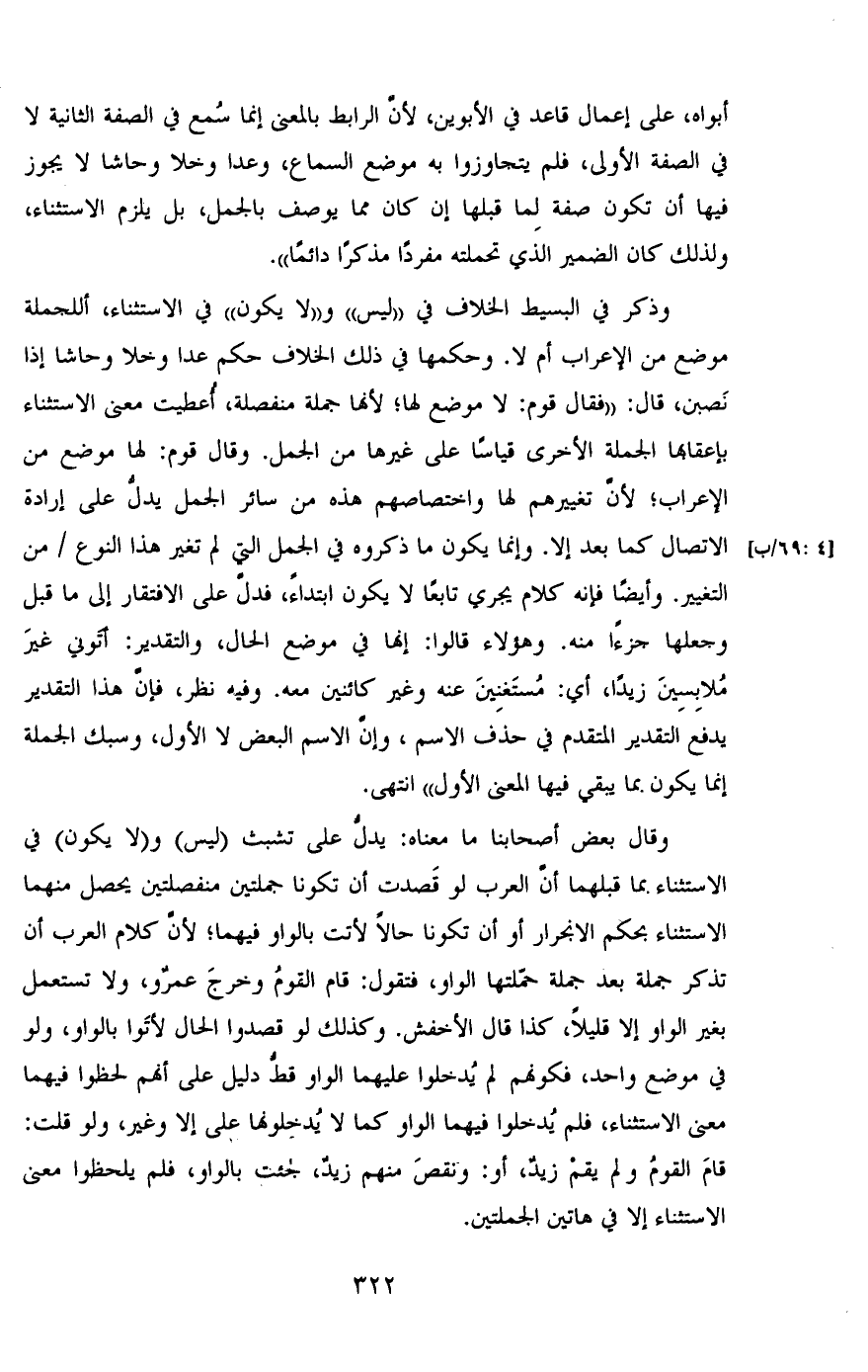 وقال بعض أصحابنا ما معناه: يدل على تشبث (ليس) و (لا يكون) في الاستثناء بما قبلهما أن العرب لو قصدت أن تكونا جملتين منفصلتين يحصل منهما الاستثناء بحكم الانجرار أو أن تكونا حالًا لأتت بالواو فيهما؛ لأن كلام العرب أن تذكر جملة بعد جملة حملتها الواو، فتقول: قام القوم وخرج عمروٌ، ولا تستعمل بغير الواو إلا قليلًا، كذا قال الأخفش. وكذلك لو قصدوا الحال لأتوا بالواو، ولو في موضع واحد، فكونهم لم يُدخلوا عليهما الواو قط دليل على أنهم لحظوا فيهما معنى الاستثناء، فلم يُدخلوا فيهما الواو كما لا يُدخلونها على إلا وغير، ولو قلت: قام القوم ولم يقم زيدٌ، أو: ونقص منهم زيدٌ، لجئت بالواو، فلم يلحظوا معنى الاستثناء إلا في هاتين الجملتين.