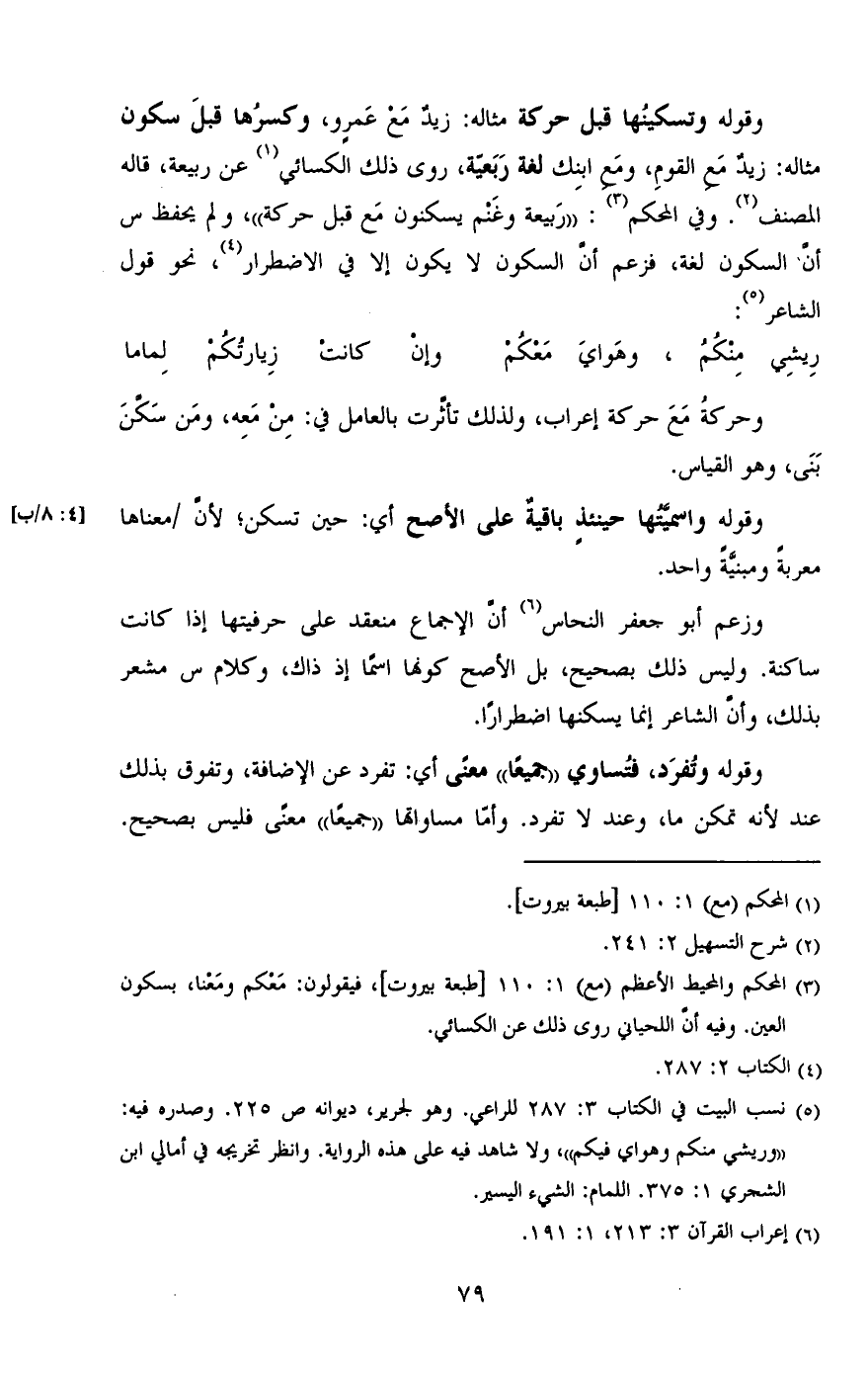 وزعم أبو جعفر النحاس أن الإجماع منعقد على حرفيتها إذا كانت ساكنة. وليس ذلك بصحيح، بل الأصح كونها اسمًا إذ ذاك، وكلام س مشعر بذلك، وأن الشاعر إنما يسكنها اضطرارًا.