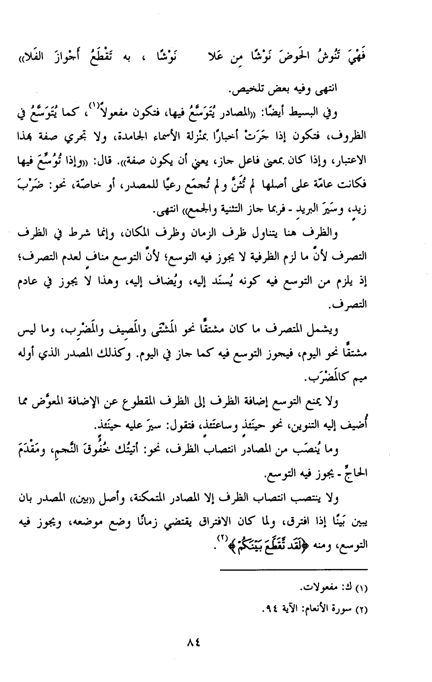 ولا ينتصب انتصاب الظرف إلا المصادر المتمكنة، وأصل "بين" المصدر بأن يبين بينًا إذا افترق، ولما كان الافتراق يقتضي زمانًا وضع موضعه، ويجوز فيه التوسع، ومنه {لَقَد تَّقَطَّعَ بَيْنَكُمْ}.