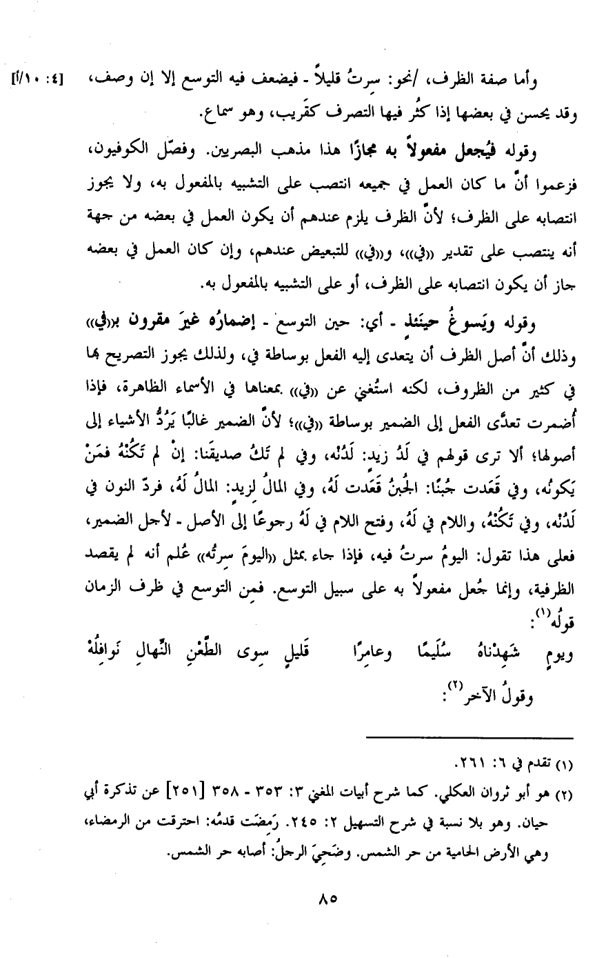 وقوله ويسوغ حينئٍذ - أي: حين التوسع- إضماره غير مقرون بـ "في" وذلك أن أصل الظرف أن يتعدى إليه الفعل بوساطة في، ولذلك يجوز التصريح بها في كثير من الظروف، لكنه استغنى عن "في" بمعناها في الأسماء الظاهرة، فإذا أضمرت تعدي الفعل إلى الضمير بوساطة "في"؛ لأن الضمير غالبًا يرد الأشياء إلى أصولها؛ ألا ترى قولهم في لد زيد: لدنه، وفي لم تك صديقنا: إن لم تكنه فمن يكونه، وفي قعدت جبنًا: الجبن قعدت له، وفي المال لزيٍد: المال له، فرد النون في لدنه، وفي تكنه، واللام في له، وفتح اللام في له رجوعًا إلى الأصل - لأجل الضمير، فعلى هذا تقول: اليوم سرت فيه، فإذا جاء بمثل "اليوم سرته" علم أنه لم يقصد الظرفية، وإنما جعل مفعولًا به على سبيل التوسع. فمن التوسع في ظرف الزمان قوله: