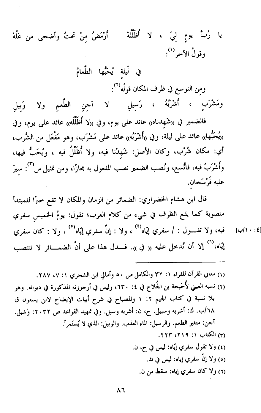 فالضمير في "شهدناه" عائد على يوم، وفي "لا أظلله" عائد على يوم، وفي "يحبها" عائد على ليلة، وفي "أشربه" عائد على مشرب، وهو مفعل من الشرب، أي: مكان شرب، وكان الأصل: شهدنا فيه، ولا أظلل فيه، ويحب فيها، وأشرب فيه، فاتسع، ونصب الضمير نصب المفعول به مجازًا، ومن تمثيل س: سير عليه فرسخان.