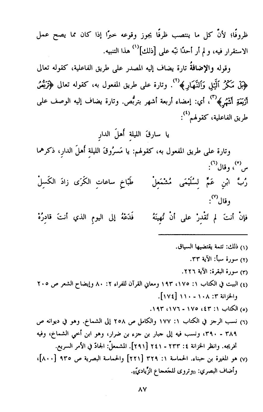 وقوله والإضافة تارة يضاف إليه المصدر على طريق الفاعلية، كقوله تعالى {بَلْ مَكْرُ اللَّيْلِ وَالنَّهَارِ}. وتارة على طريق المفعول به، كقوله تعالى {تَرَبُّصُ أَرْبَعَةِ أَشْهُرٍ}، أي: إمضاء أربعة أشهر بتربص. وتارة يضاف إليه الوصف على طريق الفاعلية، كقولهم: