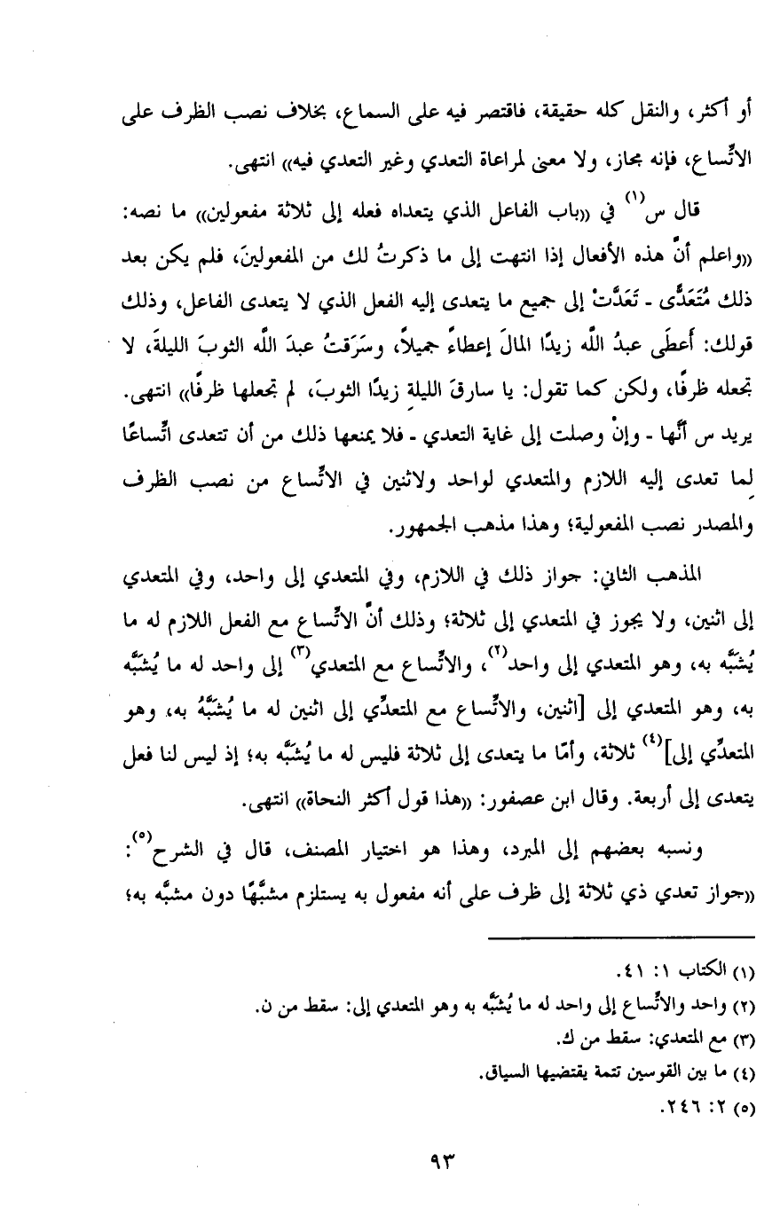 قال س في «باب الفاعل الذي يتعداه فعله إلى ثلاثة مفعولين» ما نص: «واعلم أن هذه الأفعال إذا انتهت إلى ما ذكرت لك من المفعولين، فلم يكن بعد ذلك متعدى- تعدت إلى جميع ما يتعدى إليه الفعل الذي لا يتعدى الفاعل، وذلك قولك: أعطى عبد الله زيداً المال إعطاء جميلاً، وسرقت عبد الله الثوب الليلة، لا تجعله ظرفاً، ولكن كما تقول: يا سارق الليلة زيداً الثوب، لم تجعلها ظرفاً» انتهى. يريد س أنها- وإن وصلت إلى غاية التعدي- فلا يمنعها ذلك من أن تتعدى اتساعاً لما تعدى إليه اللازم والمتعدي لواحد ولاثنين في الاتساع من نصب الظرف والمصدر نصب المفعولية؛ وهذا مذهب الجمهور.
