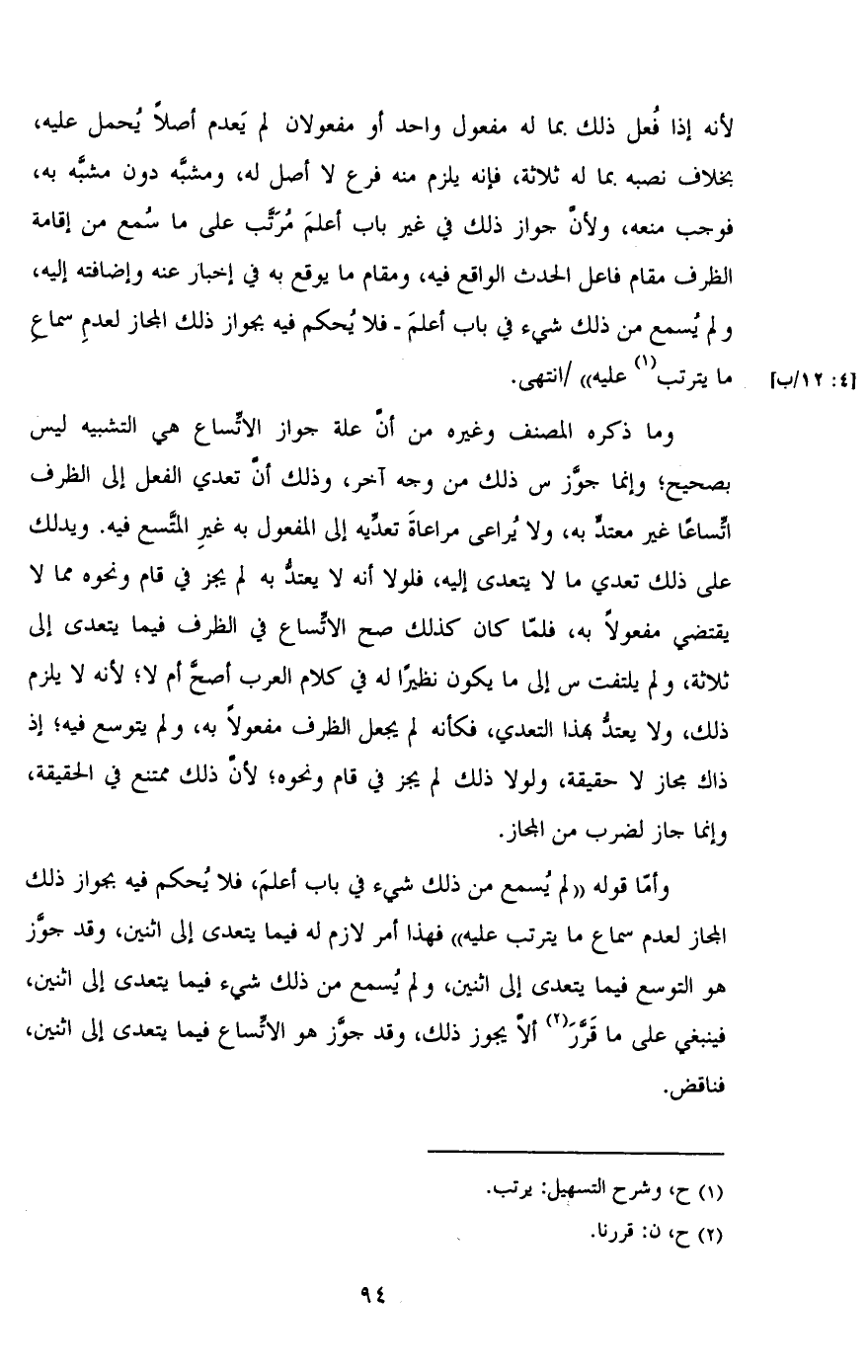 وما ذكره المصنف وغيره من أن على جواز الأتساع ي التشبيه ليس بصحيح؛ وإنما جوز س ذلك من وجه آخر، وذلك أن تعدي الفعل إلى الظرف اتساعاً غير معتد به، ولا يراعي مراعاة تعديه إلى المفعول به غير المتسع فيه. ويدللك على ذلك تعدي ما لا يتعدى إليه، فلولا أنه لا يعتد به لم يجز في قام ونحوه مما لا يقتضي مفعولاً به، فلما كان كذلك صح الأتساع في الظرف فيما يتعدى إلى ثلاثة، ولم يلتفت س إلى ما يكون نظيراً في كلام العرب أصح أم لا؛ لأنه لا يلزم ذلك، ولا يعتد بهذا التعدي، فكأنه لم يجعل الظرف مفعولاً به، ولم يتوسع فيه؛ إذ ذاك مجاز لا حقيقة، ولولا ذلك لم يجز في قام ونحوه؛ لأن ذلك ممتنع في الحقيقة، وإنما جاز لضرب من المجاز.