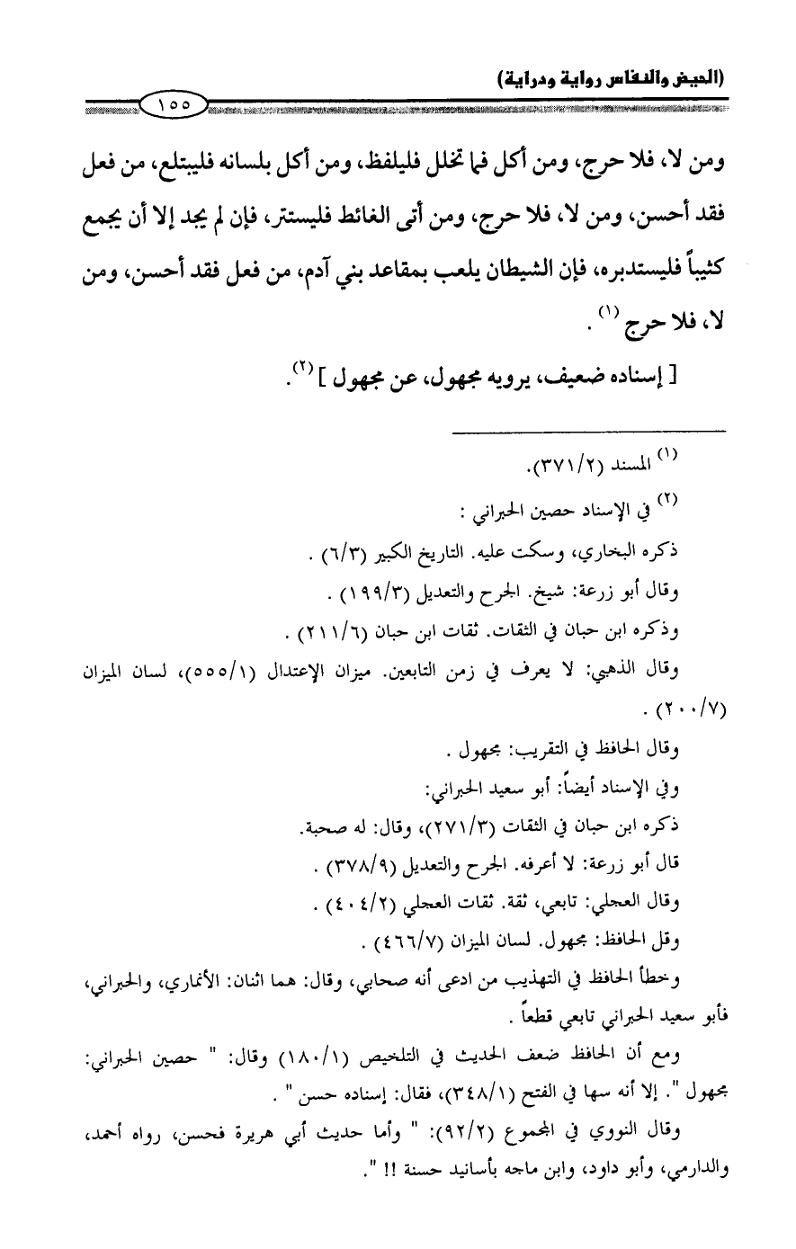 ومع أن الحافظ ضعف الحديث في التلخيص (١/ ١٨٠) وقال: "حصين الحبراني: مجهول". إلا أنه سها في الفتح (١/ ٣٤٨)، فقال: إسناده حسن".