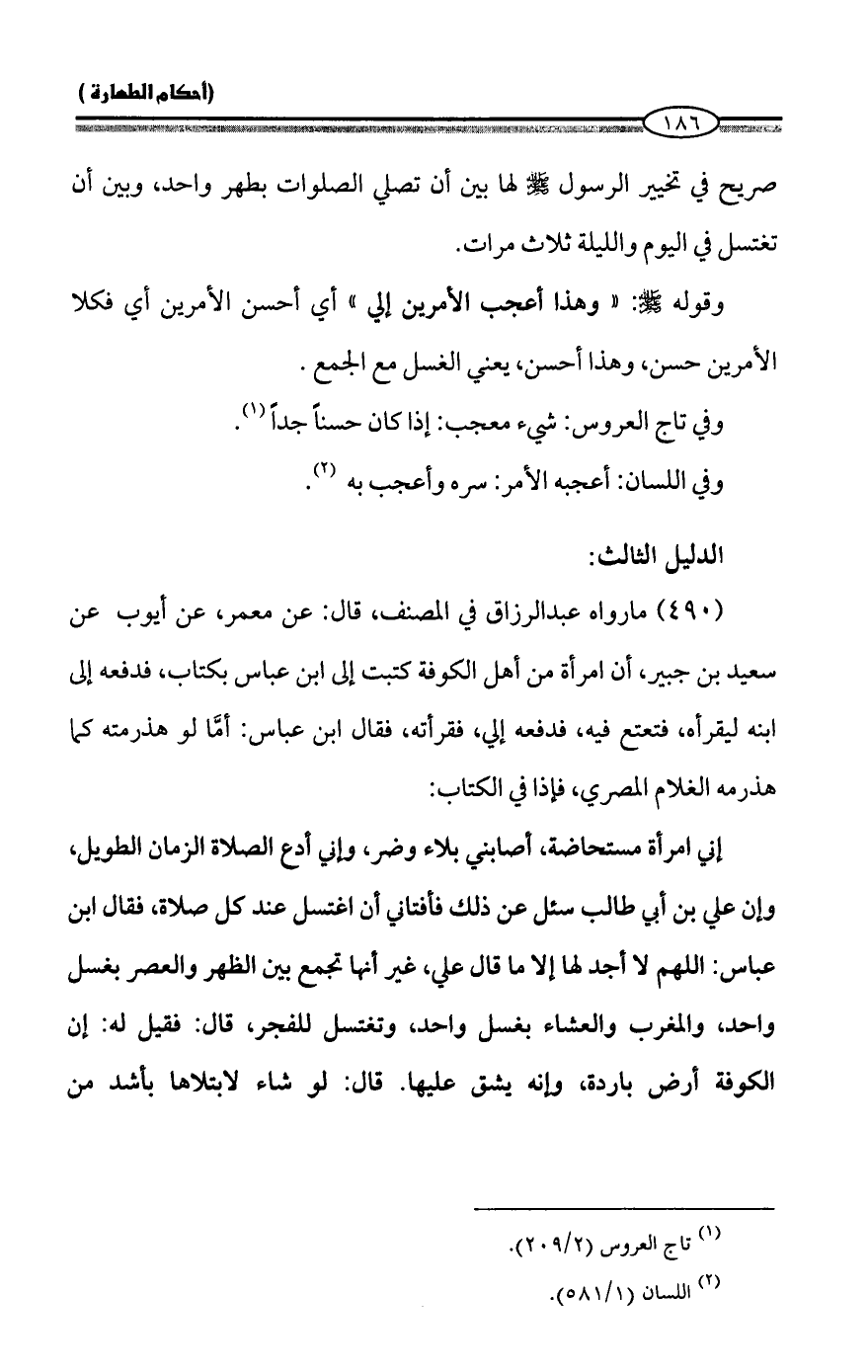 إني امرأة مستحاضة، أصابني بلاء وضر، وإني أدع الصلاة الزمان الطويل، وإن علي بن أبي طالب سئل عن ذلك فأفتاني أن اغتسل عند كل صلاة، فقال ابن عباس: اللهم لا أجد لها إلا ما قال علي، غير أنها تجمع بين الظهر والعصر بغسل واحد، والمغرب والعشاء بغسل واحد، وتغتسل للفجر، قال: فقيل له: إن الكوفة أرض باردة، وإنه يشق عليها. قال: لو شاء لابتلاها بأشد من