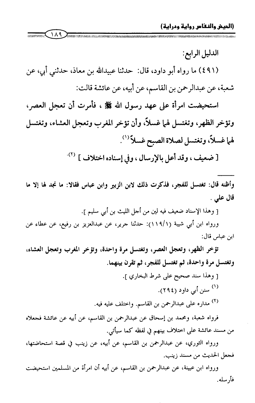 (٤٩١) ما رواه أبو داود، قال: حدثنا عبيد الله بن معاذ، حدثني أبي، عن شعبة، عن عبد الرحمن بن القاسم، عن أبيه، عن عائشة قالت: