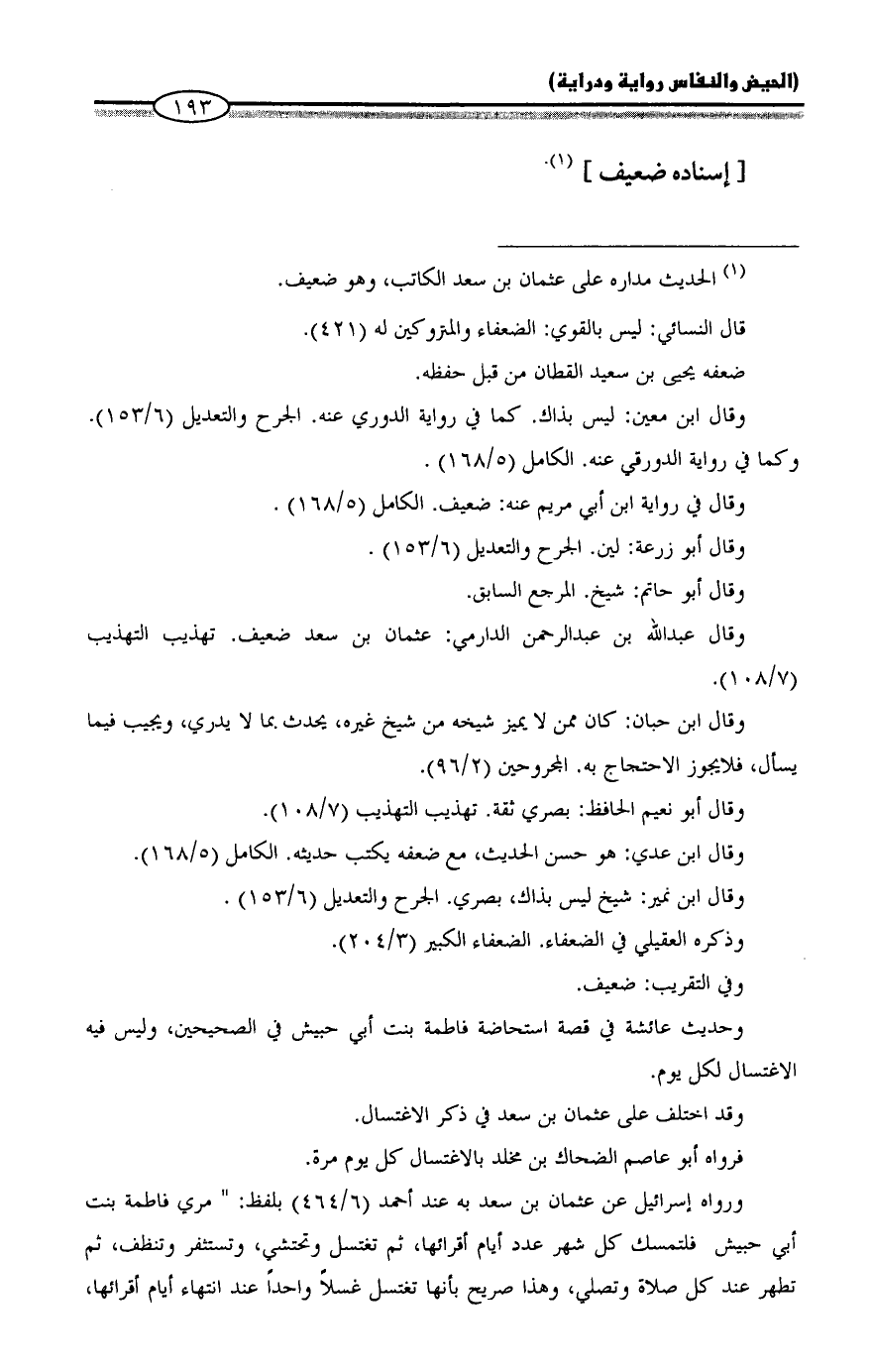ورواه إسرائيل عن عثمان بن سعد به عند أحمد (٦/ ٤٦٤) بلفظ: "مري فاطمة بنت أبي حبيش فلتمسك كل شهر عدد أيام أقرائها، ثم تغتسل وتحتشي، وتستثفر وتنظف، ثم تطهر عند كل صلاة وتصلي، وهذا صريح بأنها تغتسل غسلاً واحداً عند انتهاء أيام أقرائها،